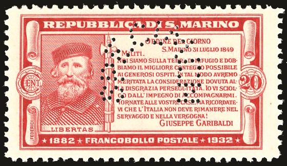 SAN MARINO 1932 - 20 cent. carminio Garibaldi, perforato "specimen", saggio (P169)