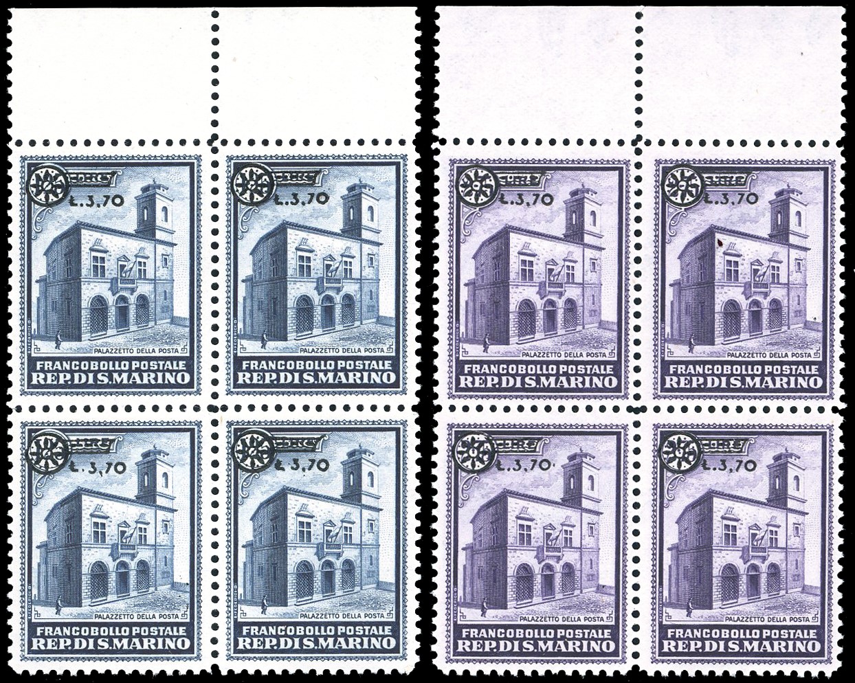 SAN MARINO 1934 - Palazzetto soprastampati, serie completa (184/185), blocchi di quattro