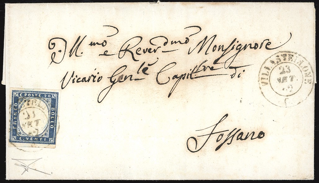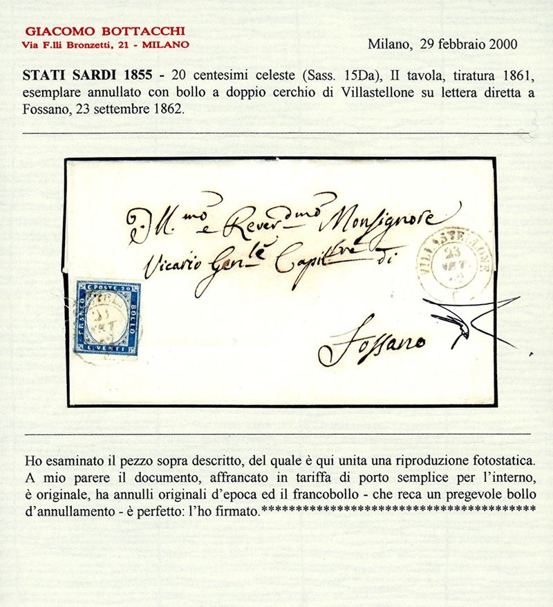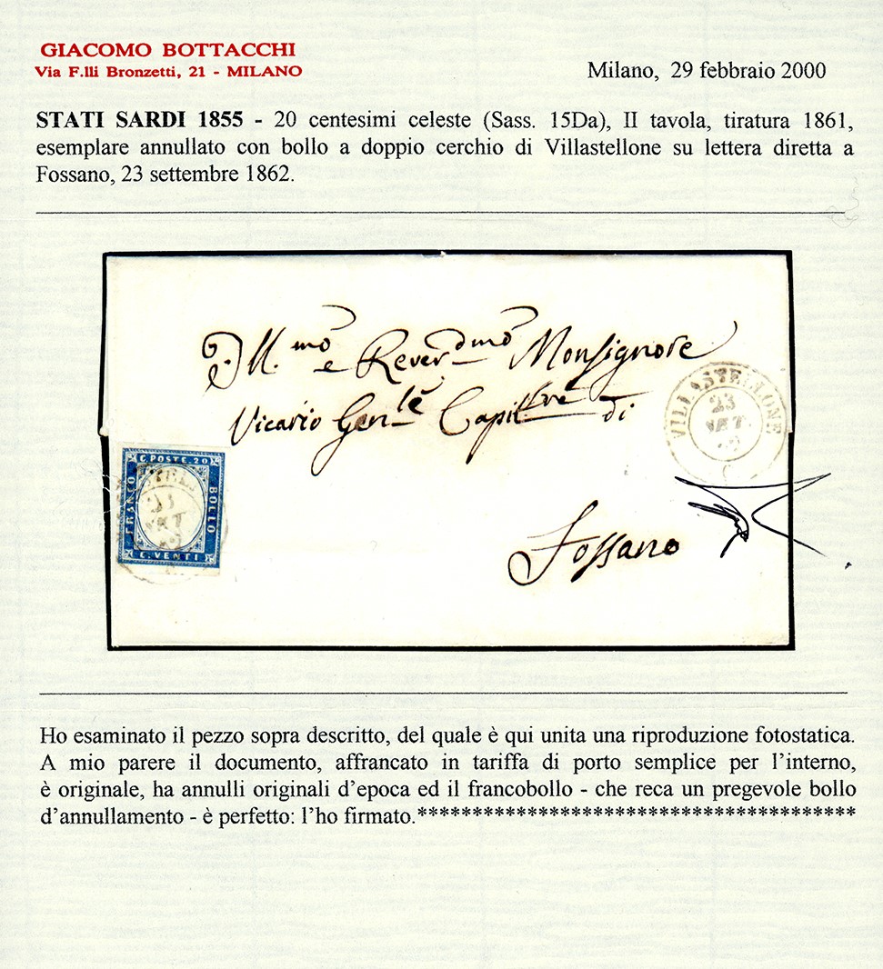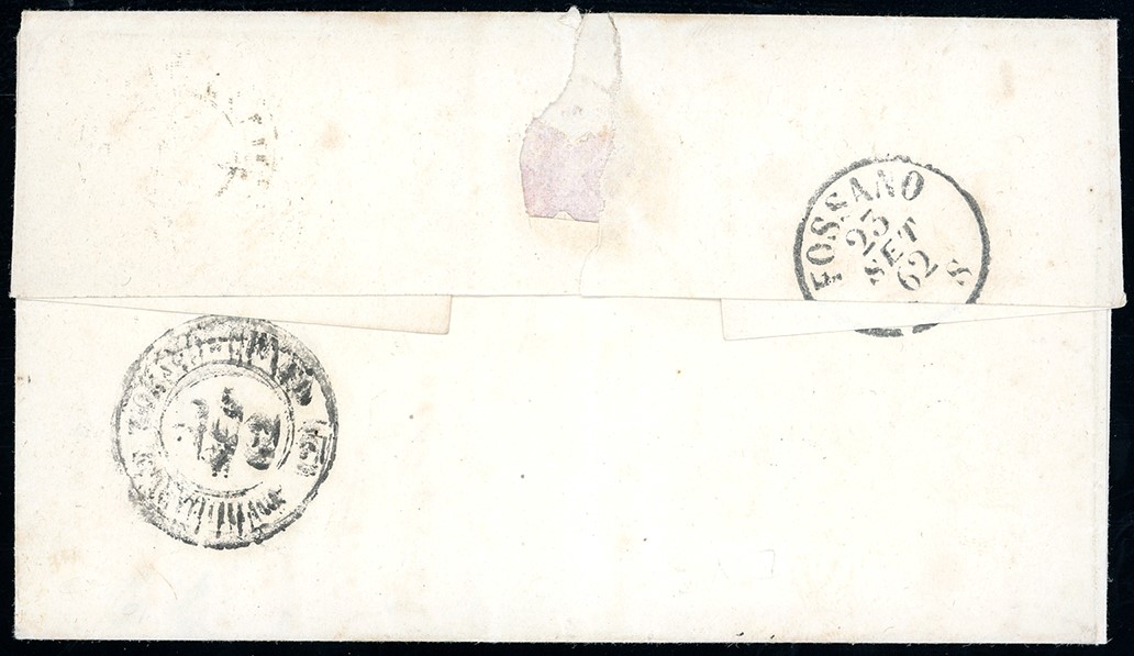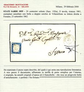 Perfetto, su fresca lettera del 23/9/1862 a Fossano. Annullo molto raro, pochissimi conosciuti. Cert. Bottacchi. Cat. €16.500