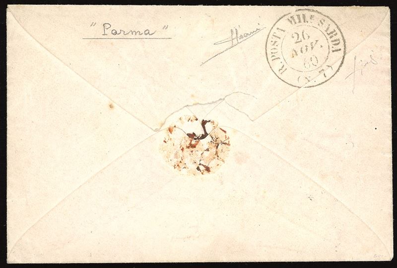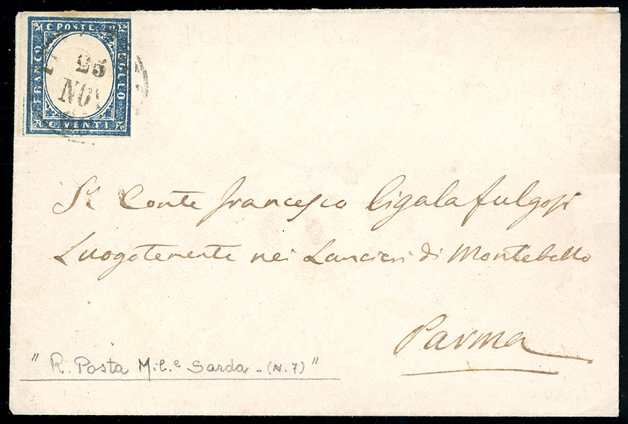 Su busta da Piacenza 25/11/1860 a Parma, indirizzata ad un Luogotenente dei Lancieri di Montebello, al verso il bollo della R.Posta Militare Sarda n. 7. Interessante e non comune. Sorani, Fiecchi.