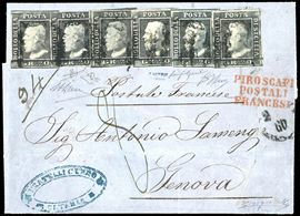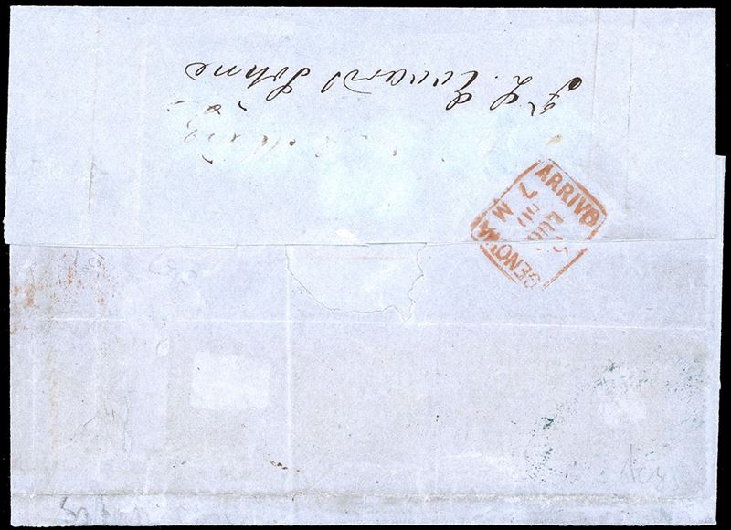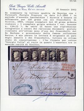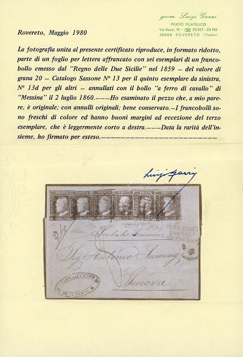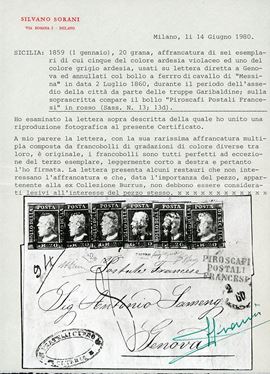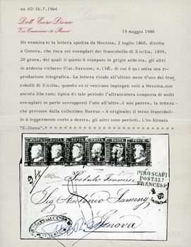 Tutti perfetti, ad eccezione del terzo esemplare, leggermente corto a destra, su lettera del peso di un'oncia e un foglio, da Messina 2/7/1860 a Genova, tassata 80 cent. La sovracoperta presenta alcuni sapienti restauri che non interessano i francobolli. Eccezionale ed unica affrancatura multipla monovalore comprendente valori gemelli e risalente all'ultimo mese d'uso dei francobolli di Sicilia, durante l'assedio di Messina. Grande rarità da esposizione! Firmata G.Oliva, A.Diena, cert. E.Diena, Colla, Sorani. Ex collezione Burrus.