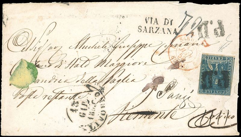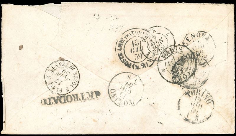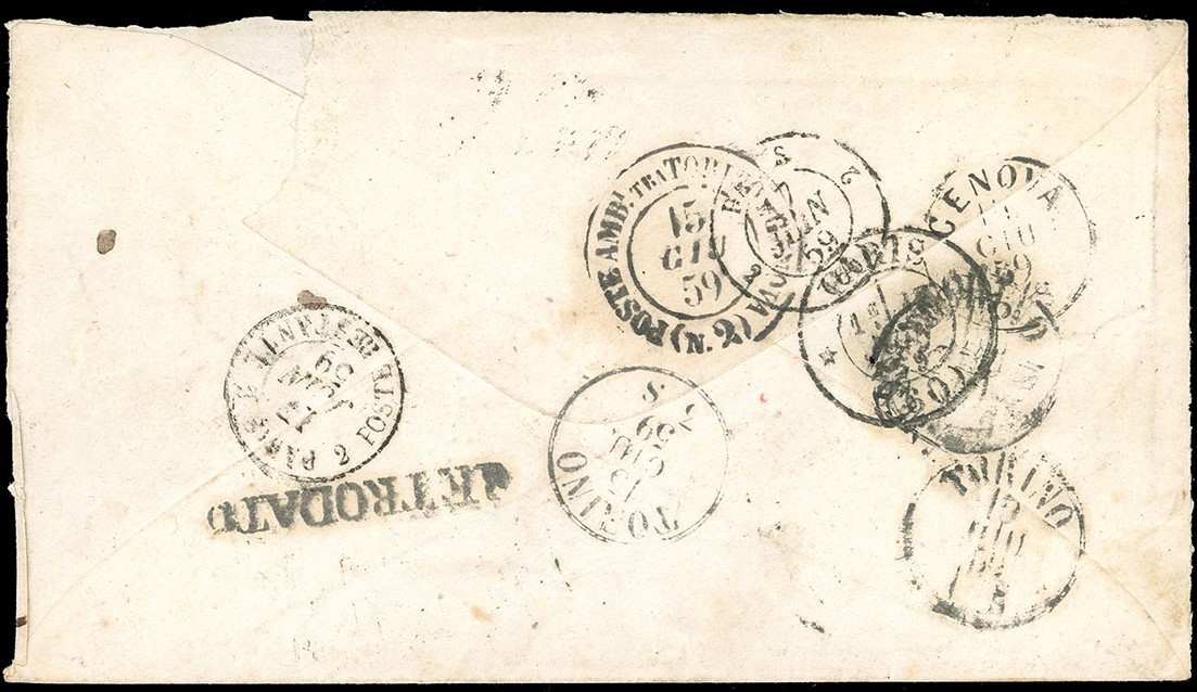 Tre ottimi margini, leggermente intaccato a destra, su lettera da Livorno 13/6/1859 a Torino, rispedita a Parigi, numerosi bolli di transito al verso tra cui il lineare "retrodato". Bella spedizione tra Stati diversi. Ferrario.