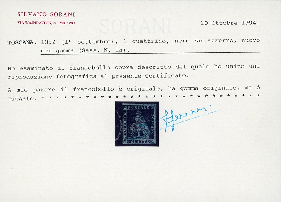 Nuovo, gomma originale, lieve piega orizzontale non detrurpante, molto fresco. Ferrario, cert. Sorani. Cat. € 40.000