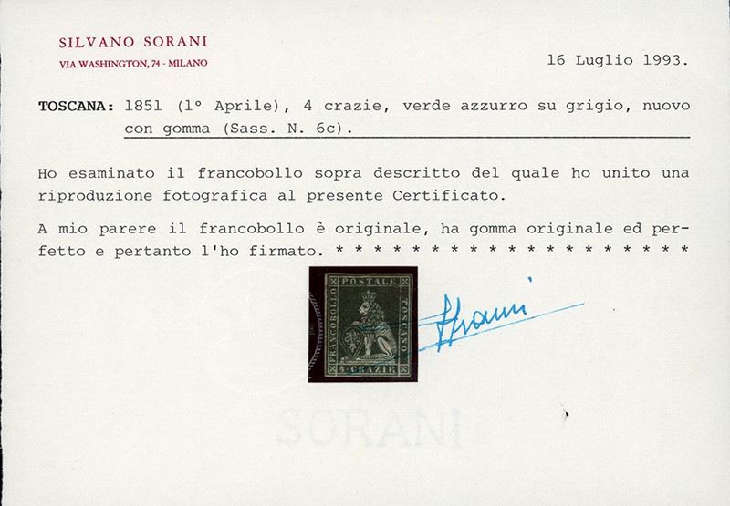 Nuovo, gomma originale, perfetto, margini bianchi. Cert. Sorani. Cat. € 20.000
