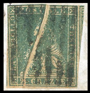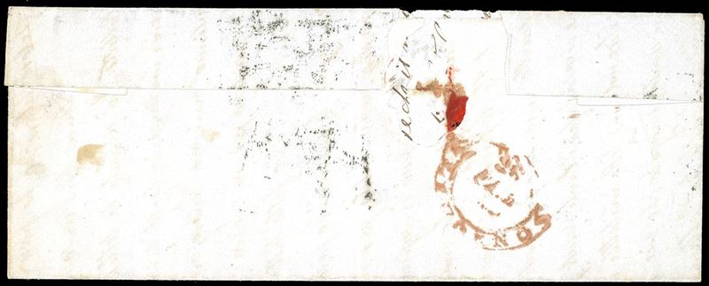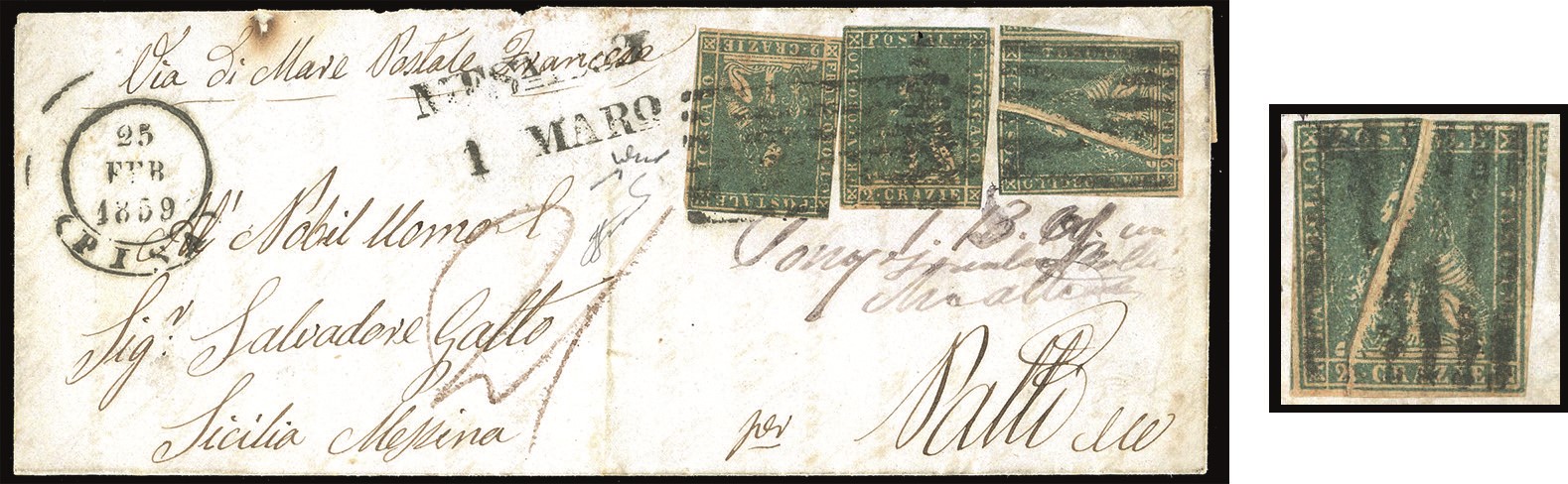 Qualche difetto di marginatura, su lettera da Pisa 25/2/1859 a Patti, in Sicilia, viaggiata con i vapori francesi, tassata 21 grana. Splendida varietà, particolarmente rara su lettera. Chiavarello, Ferrario. Cat. € 6.000