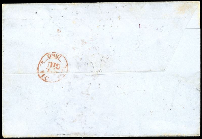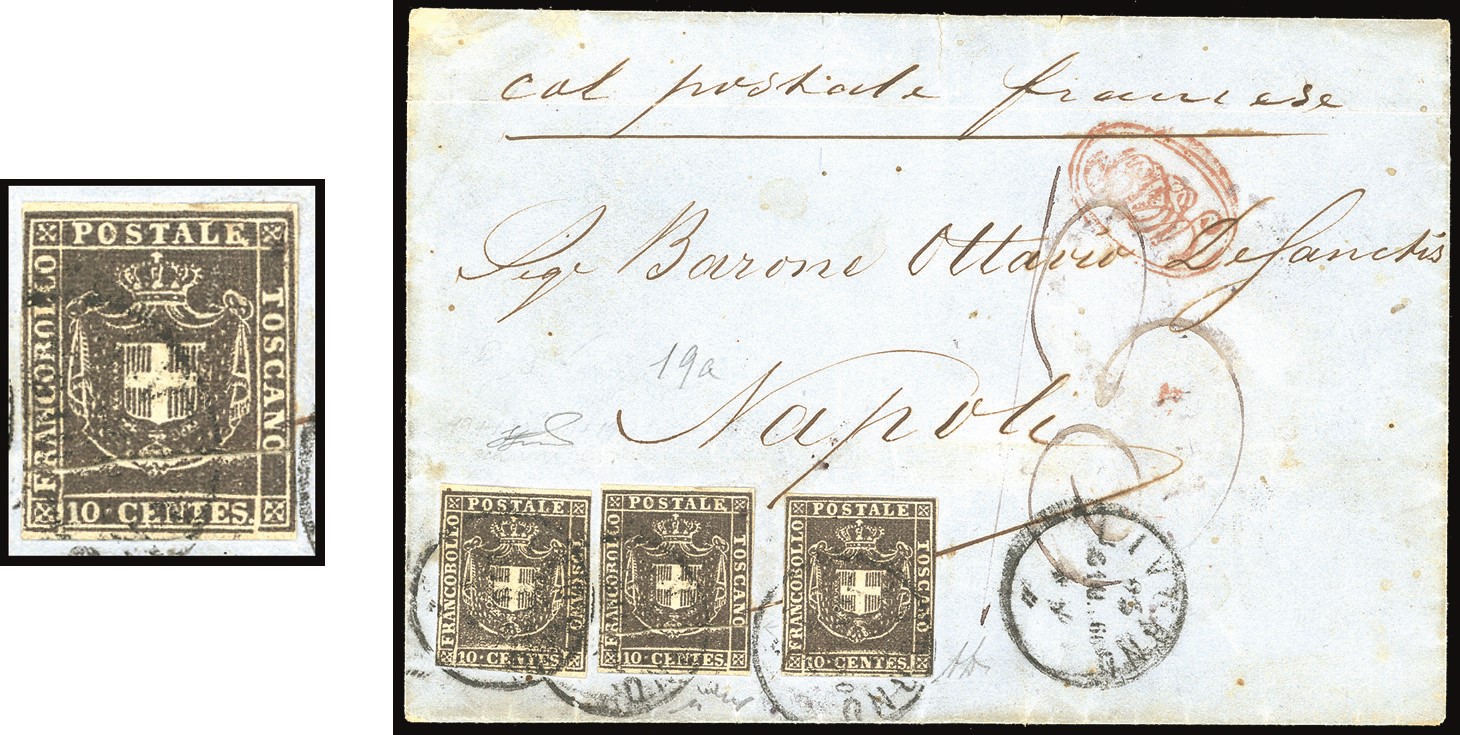 Margini da ampi a giusti, su lettera Livorno 23/6/1860 a Napoli, manoscritto "col postale francese", tassata in arrivo. Varietà molto rara su lettera. A.Diena, Chiavarello, Ferrario.