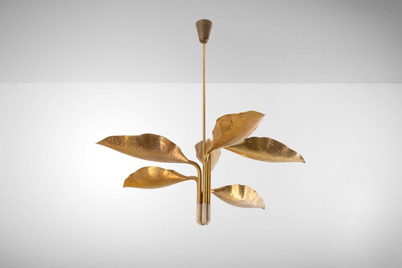 Struttura in ottone e metallo laccato con bracci orientabili in ottone martellato e microforato.