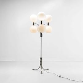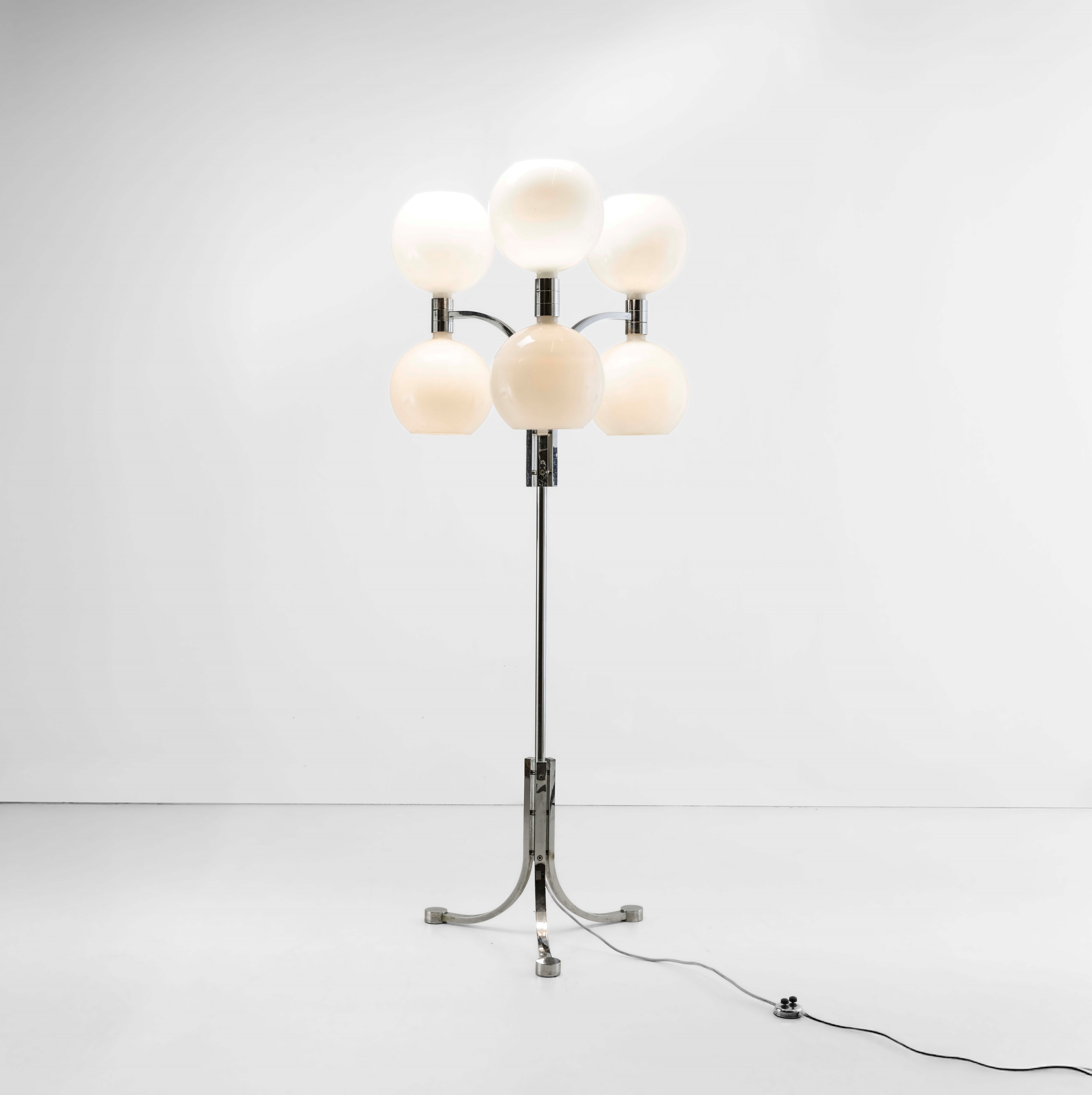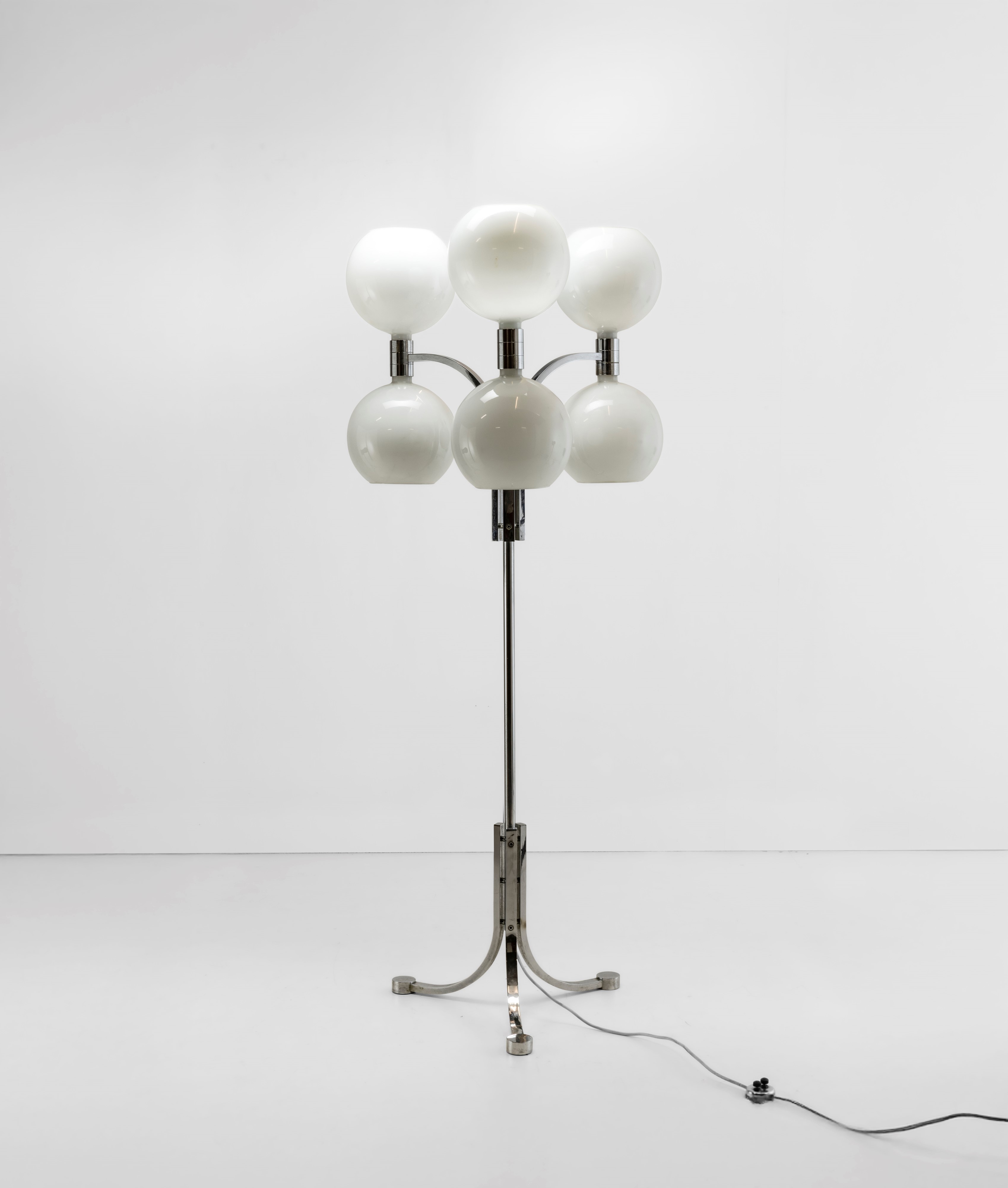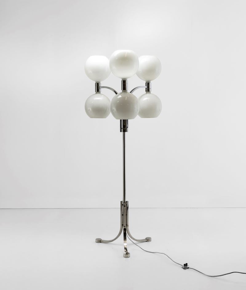 Struttura in metallo cromato, diffusori in vetro opalino.