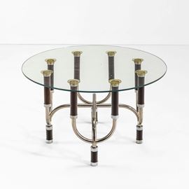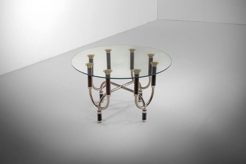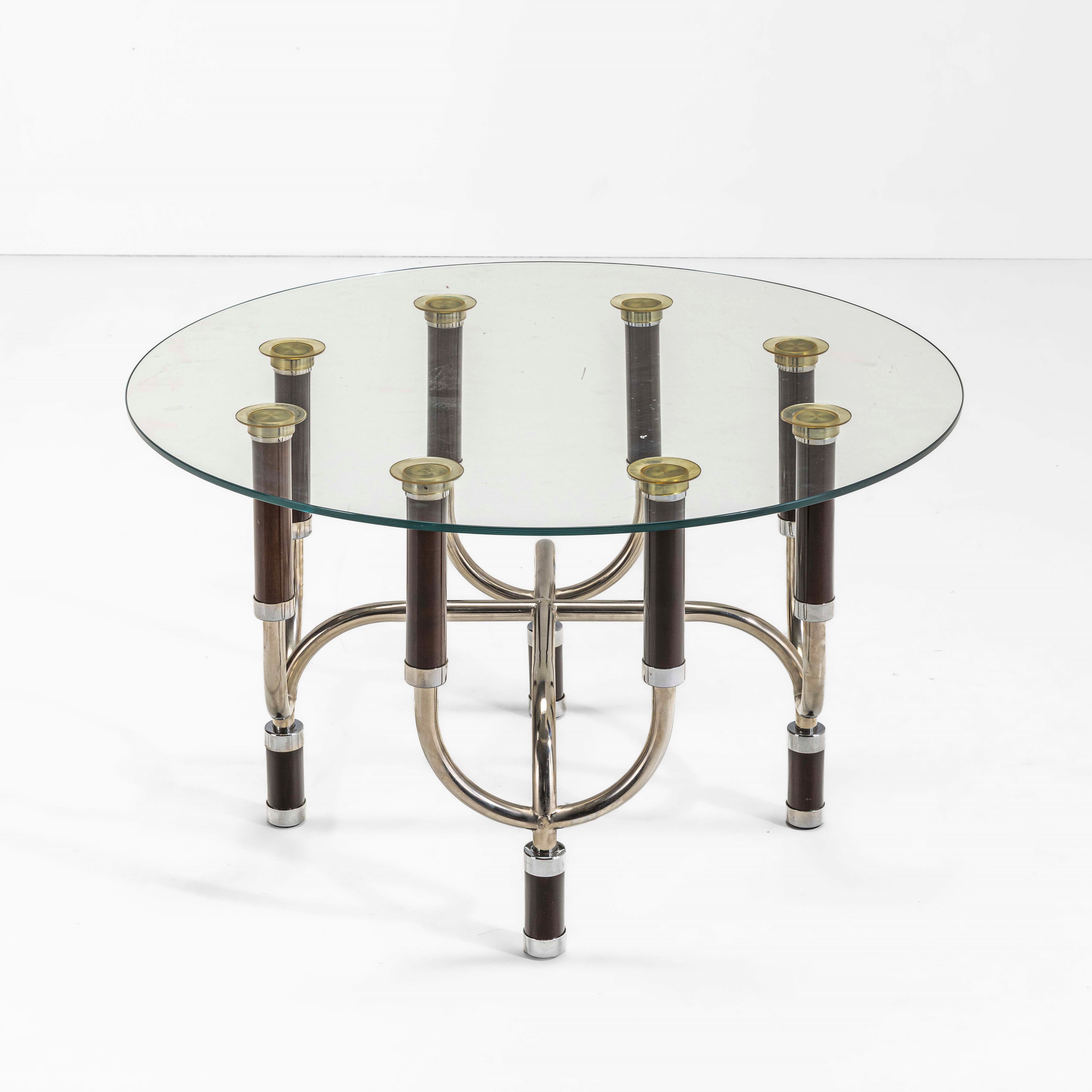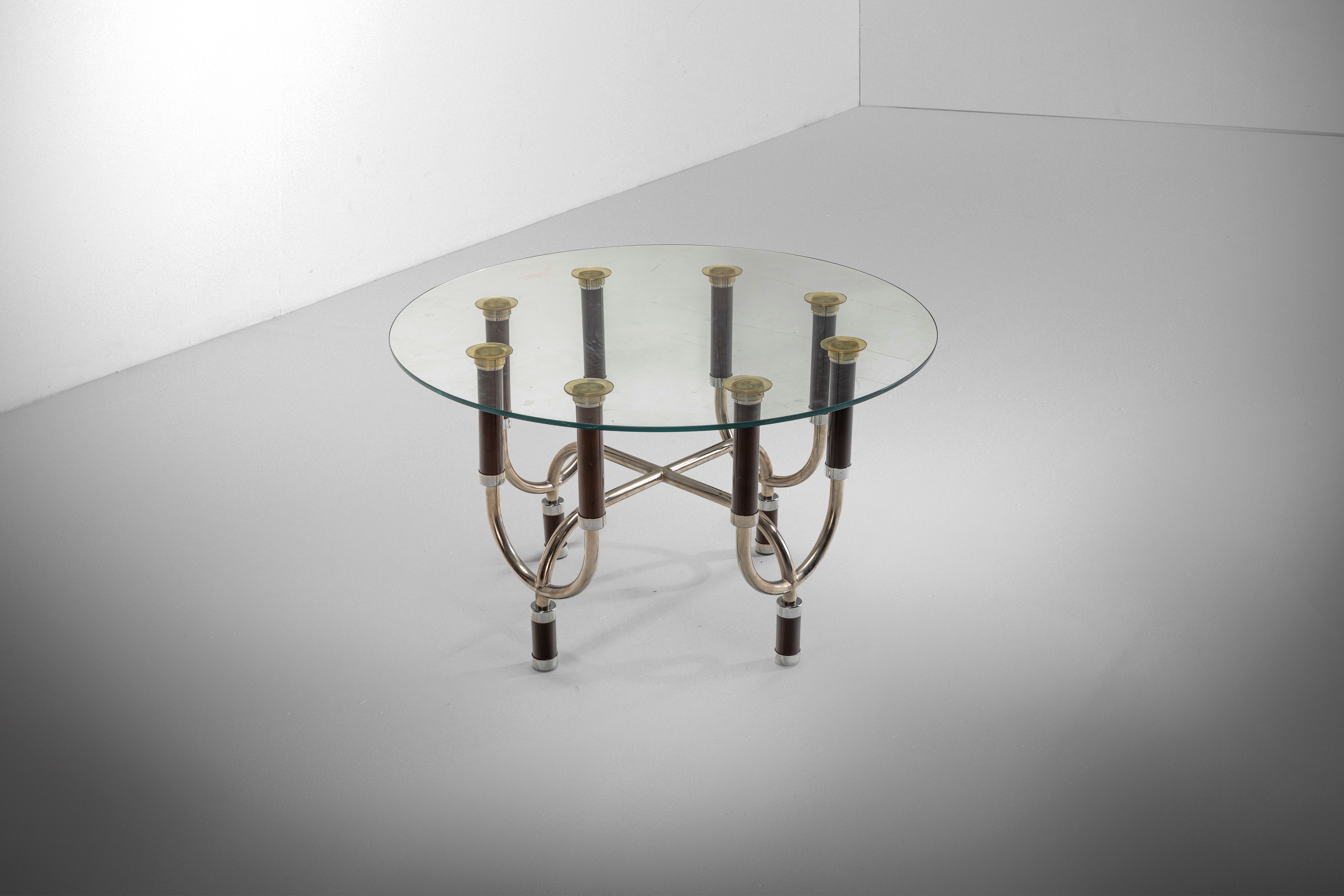 Struttura in metallo cromato e legno. Piano in cristallo molato.