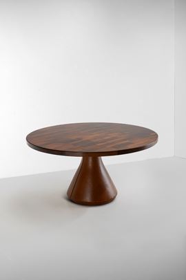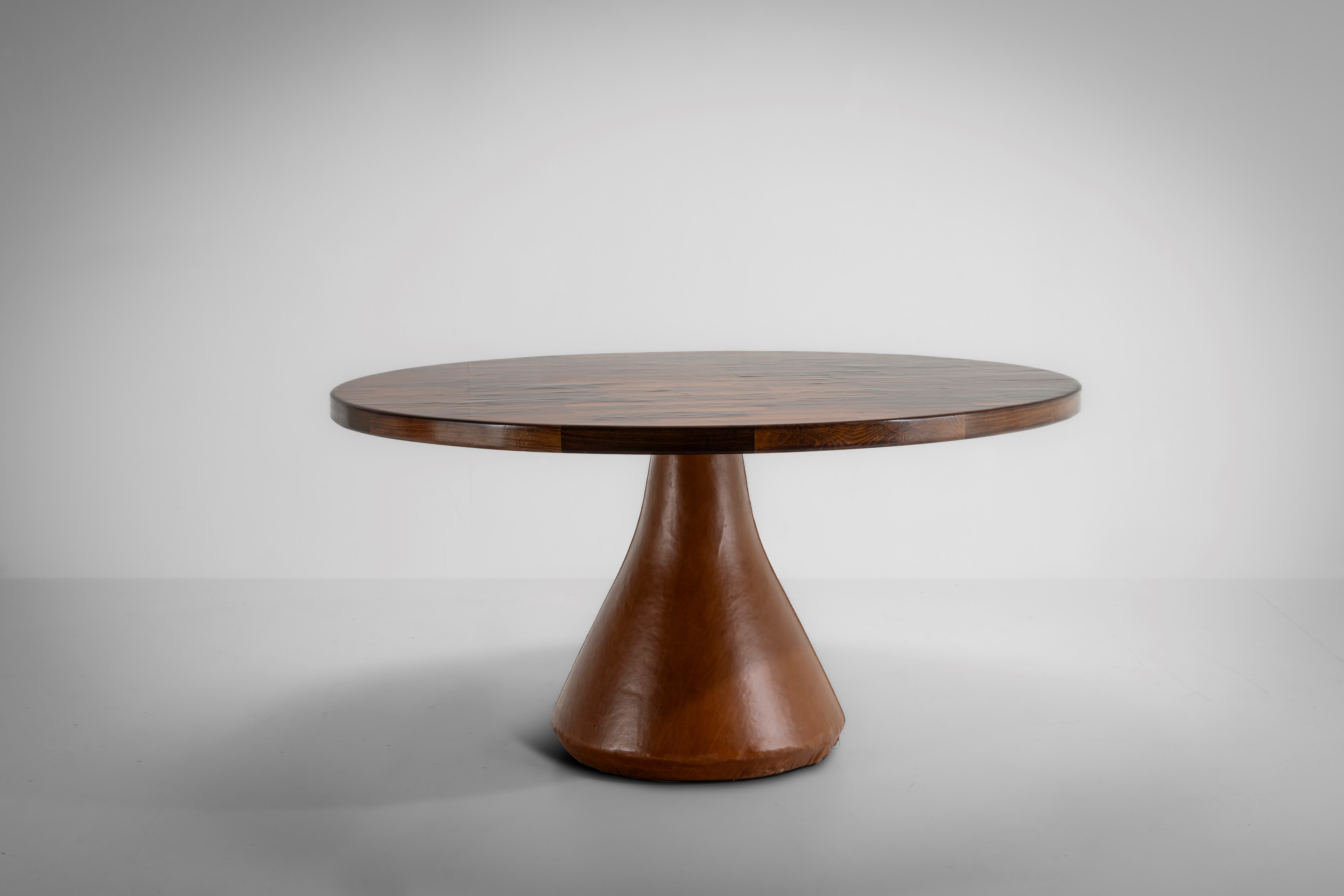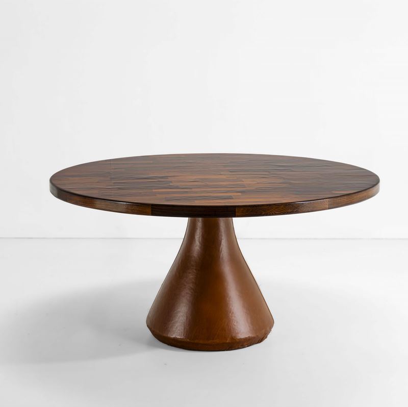 Struttura in metallo laccato, piano in legno e legno impiallacciato, base in cemento rivestita in pelle.