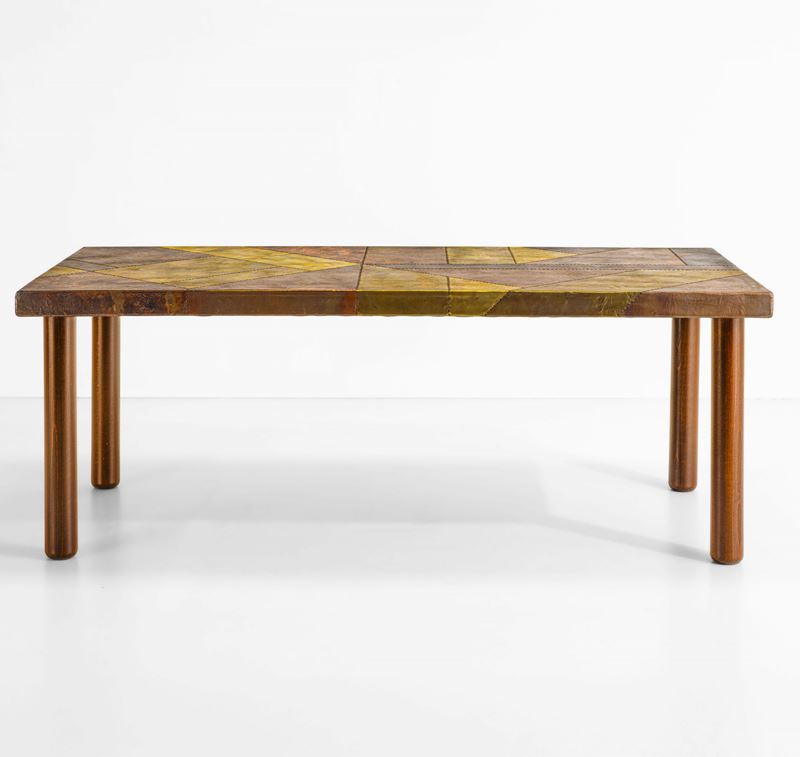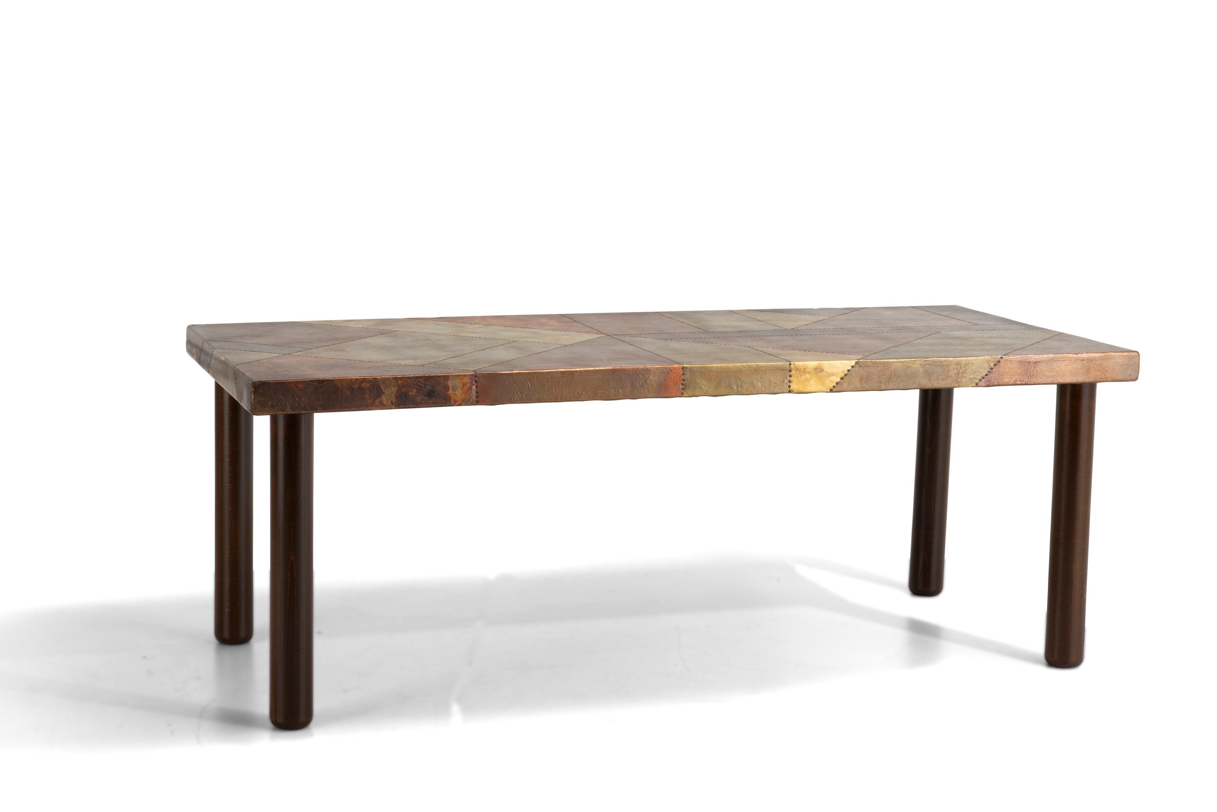 Piano in legno rivestito in rame sbalzato e ottone,