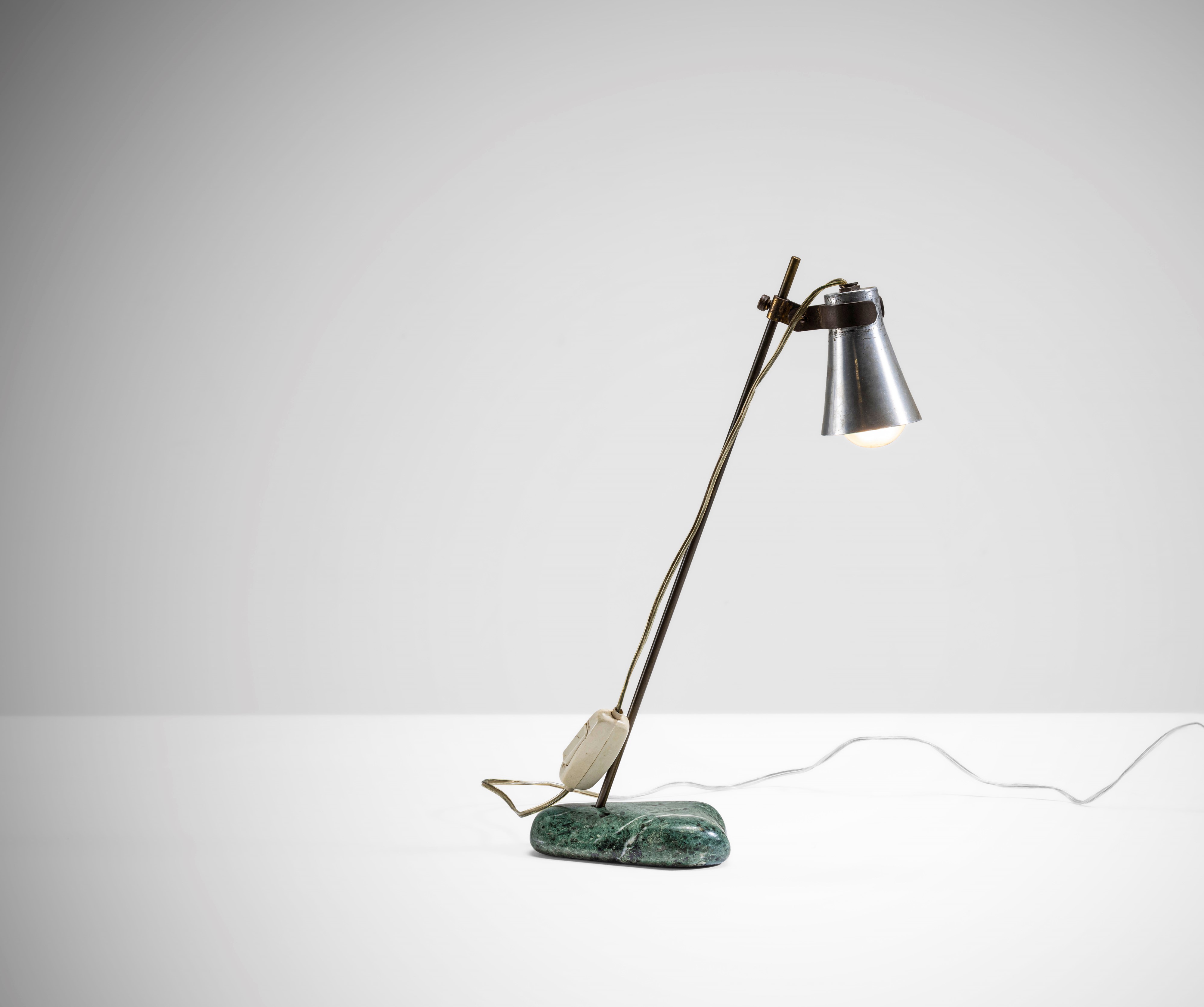 Struttura in ottone e diffusore in alluminio scorrevole su asta in ottone. Base in pietra levigata.