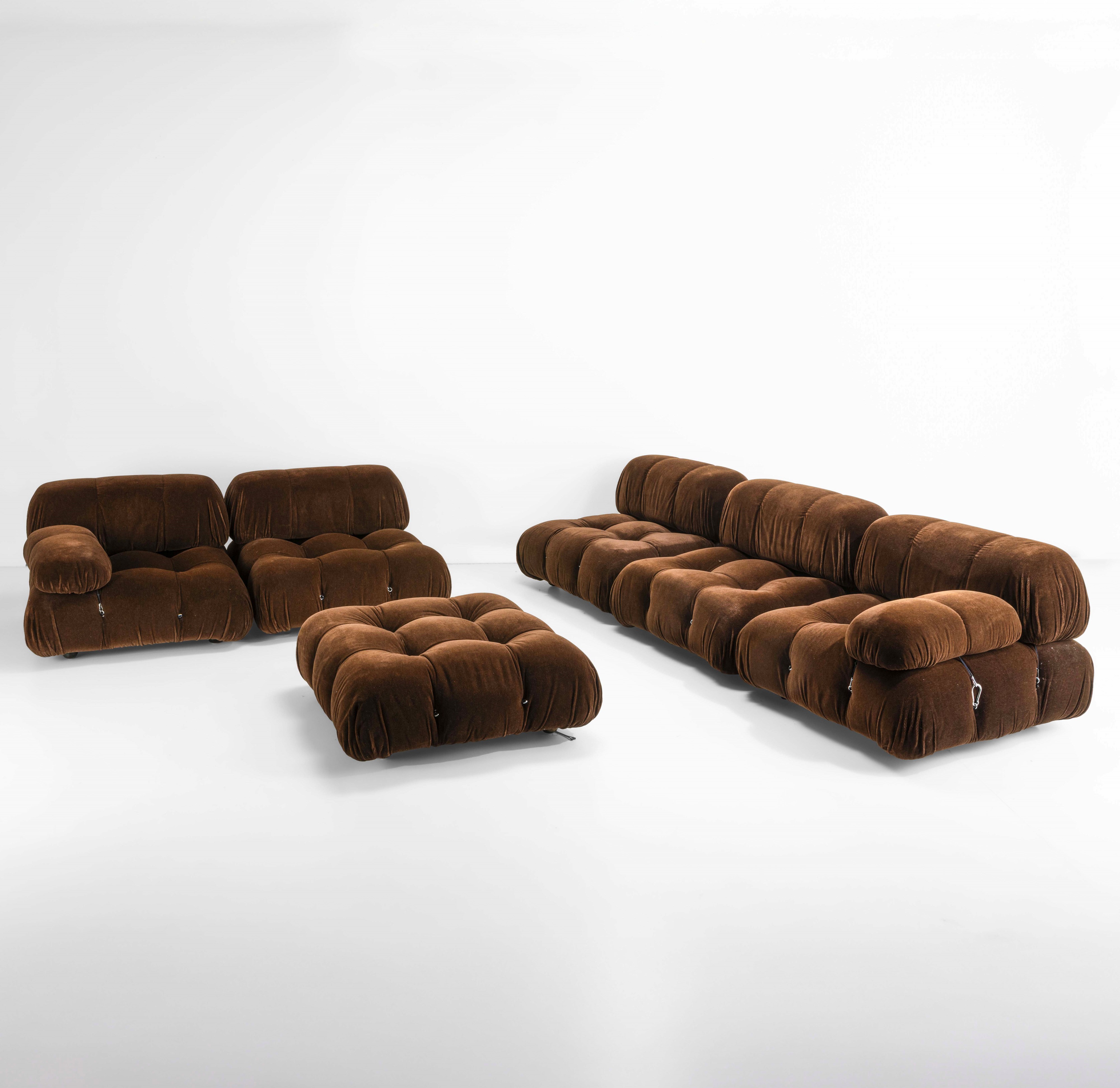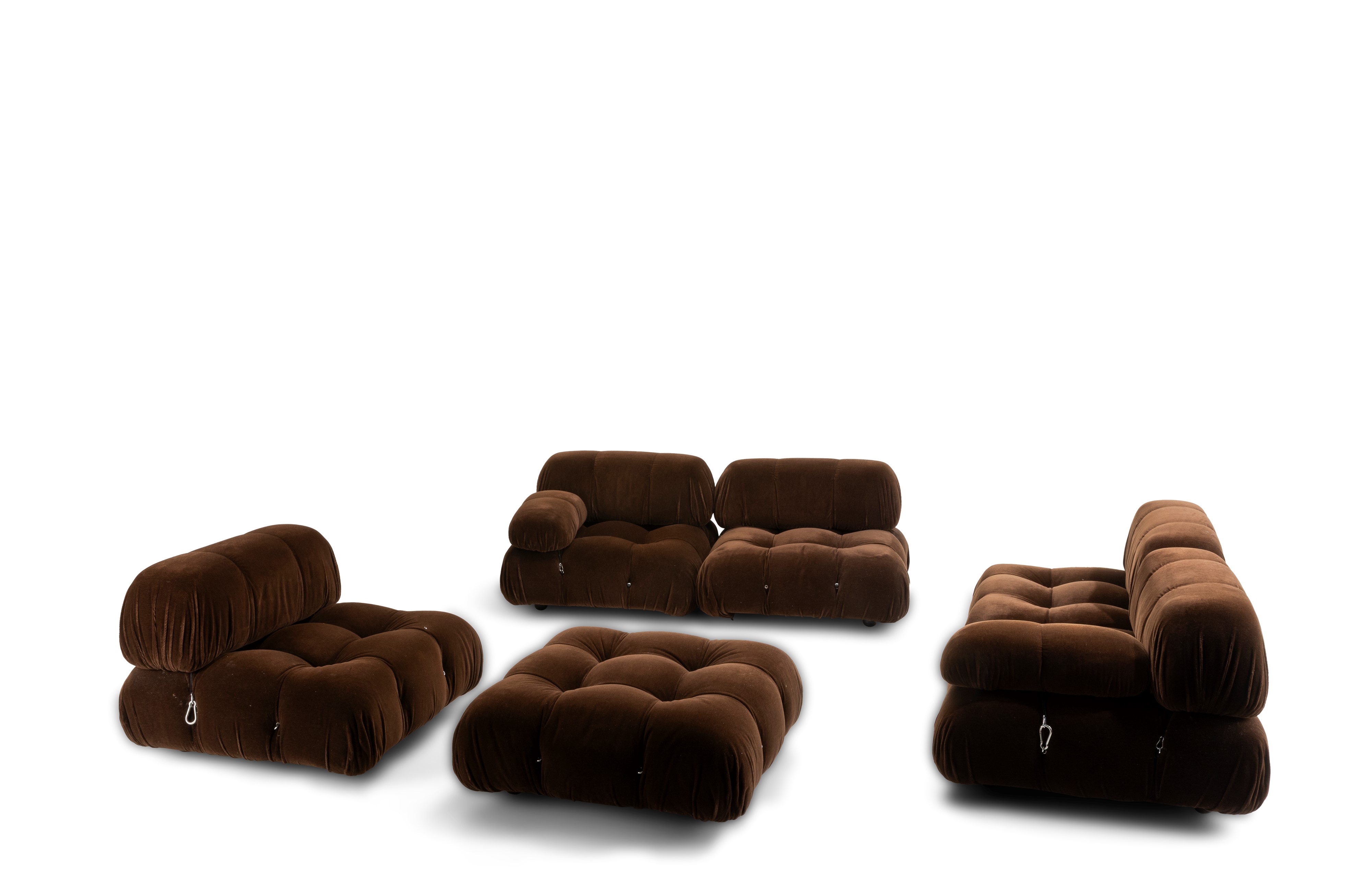 Formato da sei moduli. Struttura in legno, rivestimento in tessuto e dettagli in metallo.