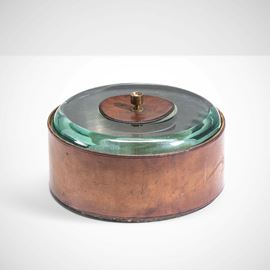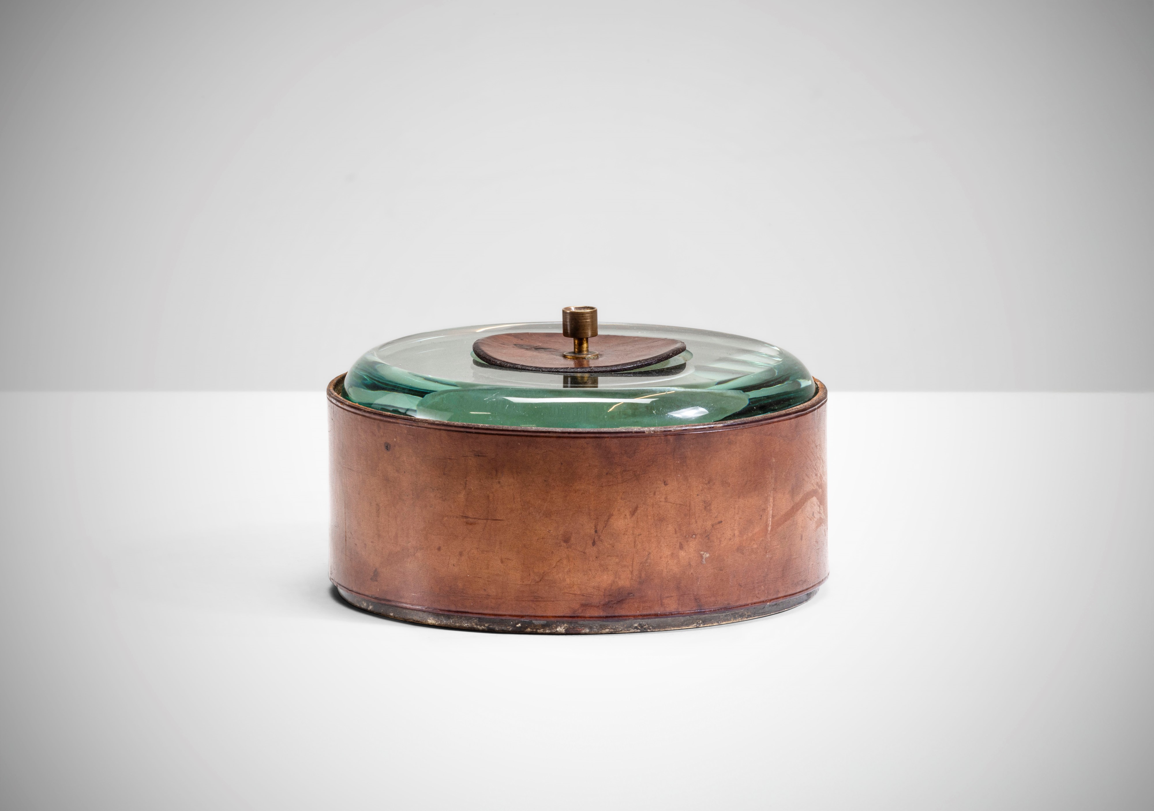 Struttura in ottone, rivestimento in cuoio. Coperchio in cristallo molato, dettagli in cuoio e ottone.