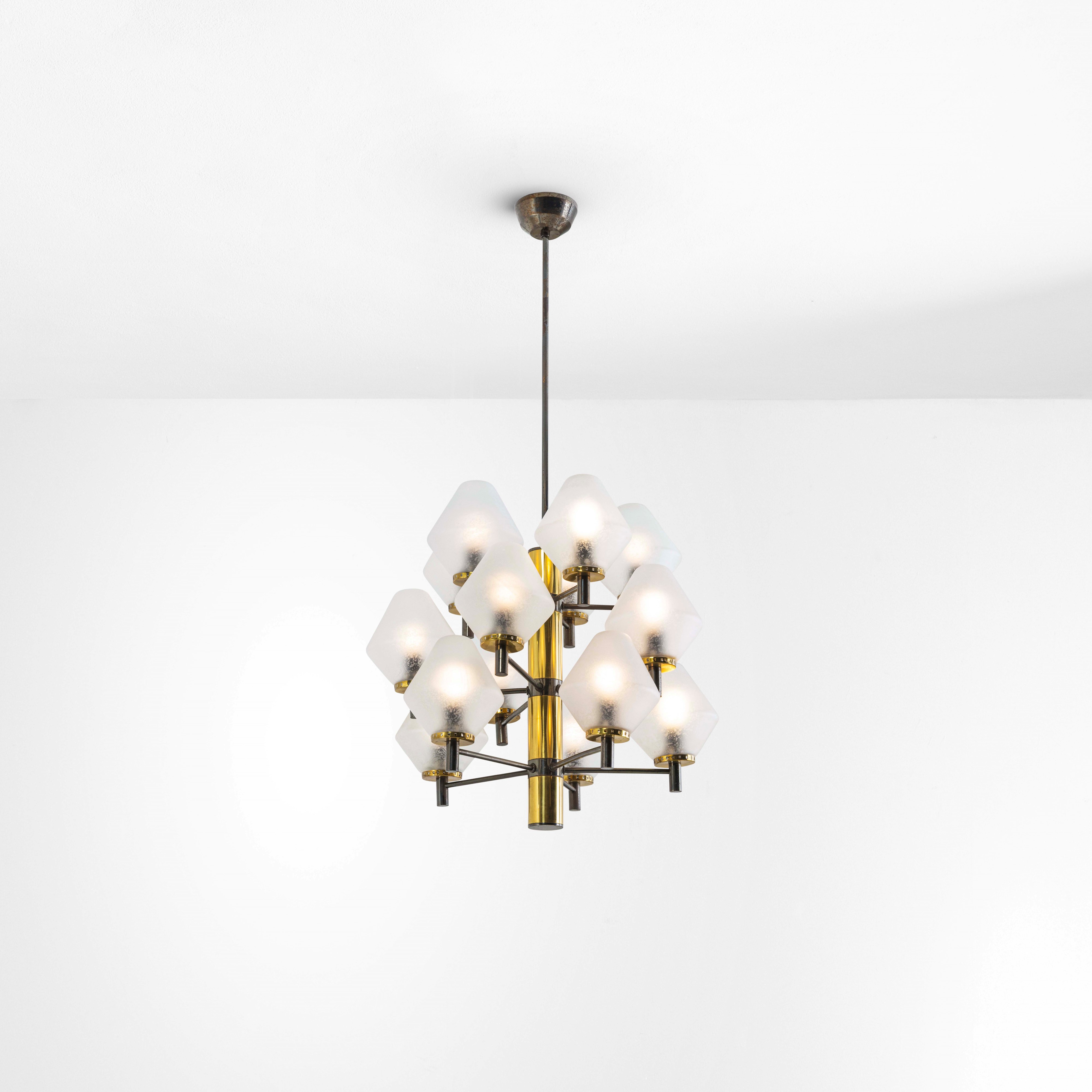 Struttura in ottone e metallo laccato, diffusori in vetro acidato.
