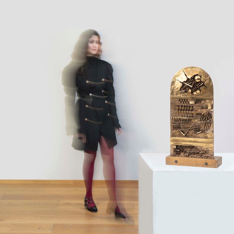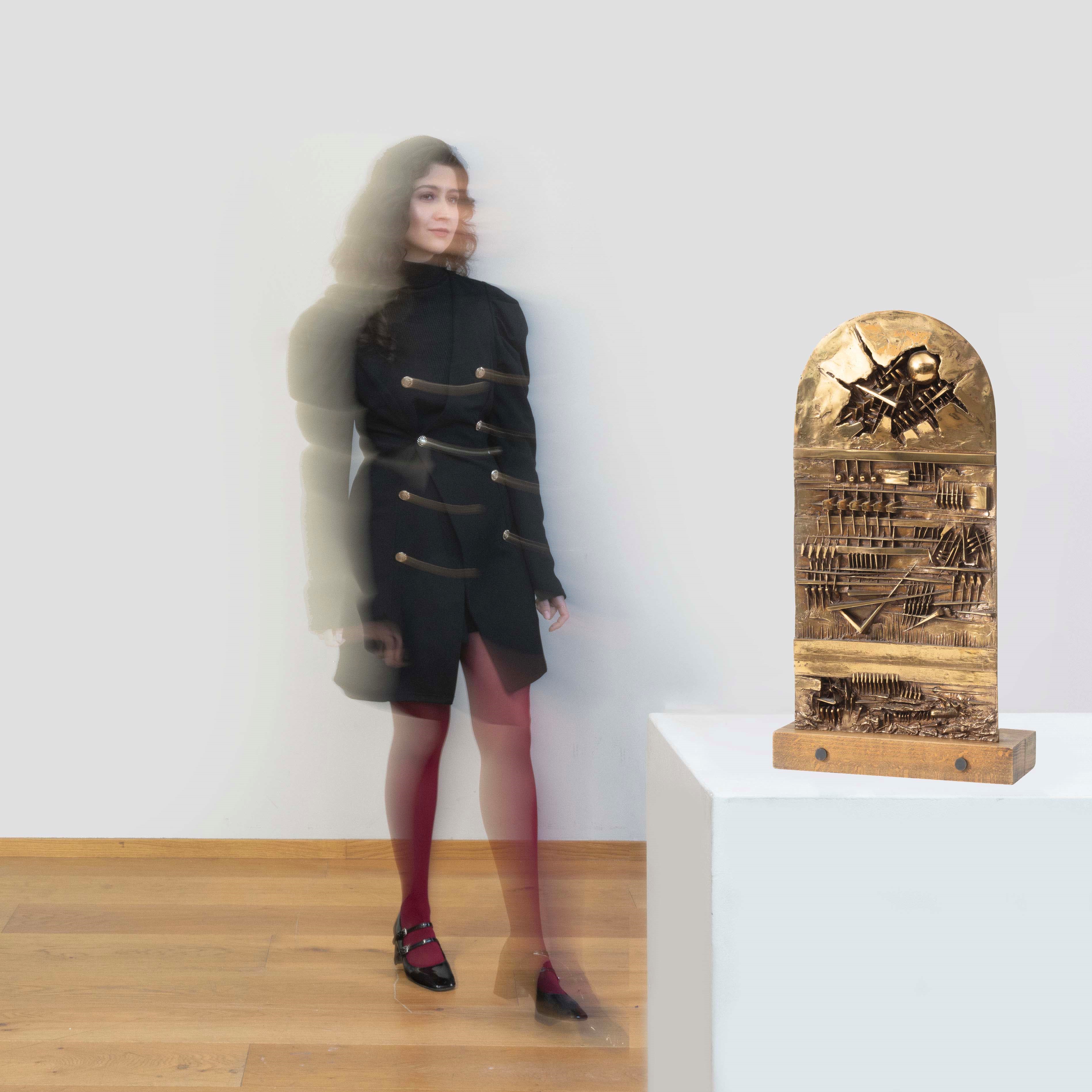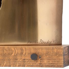 scultura in bronzo con base in legno