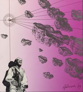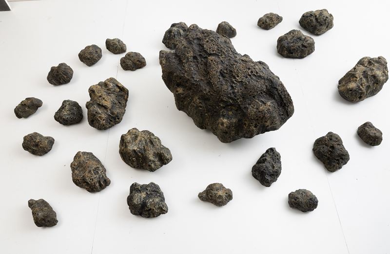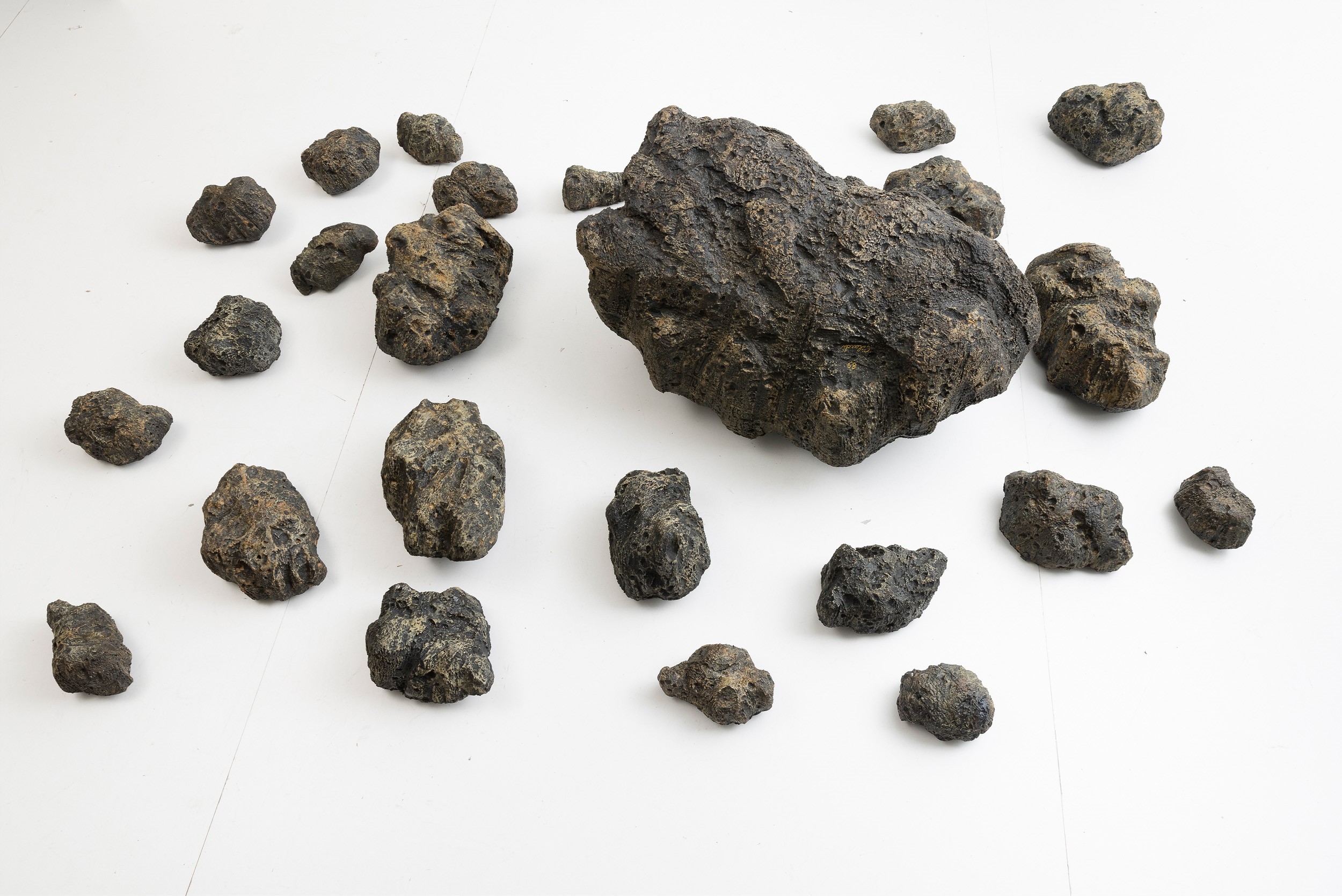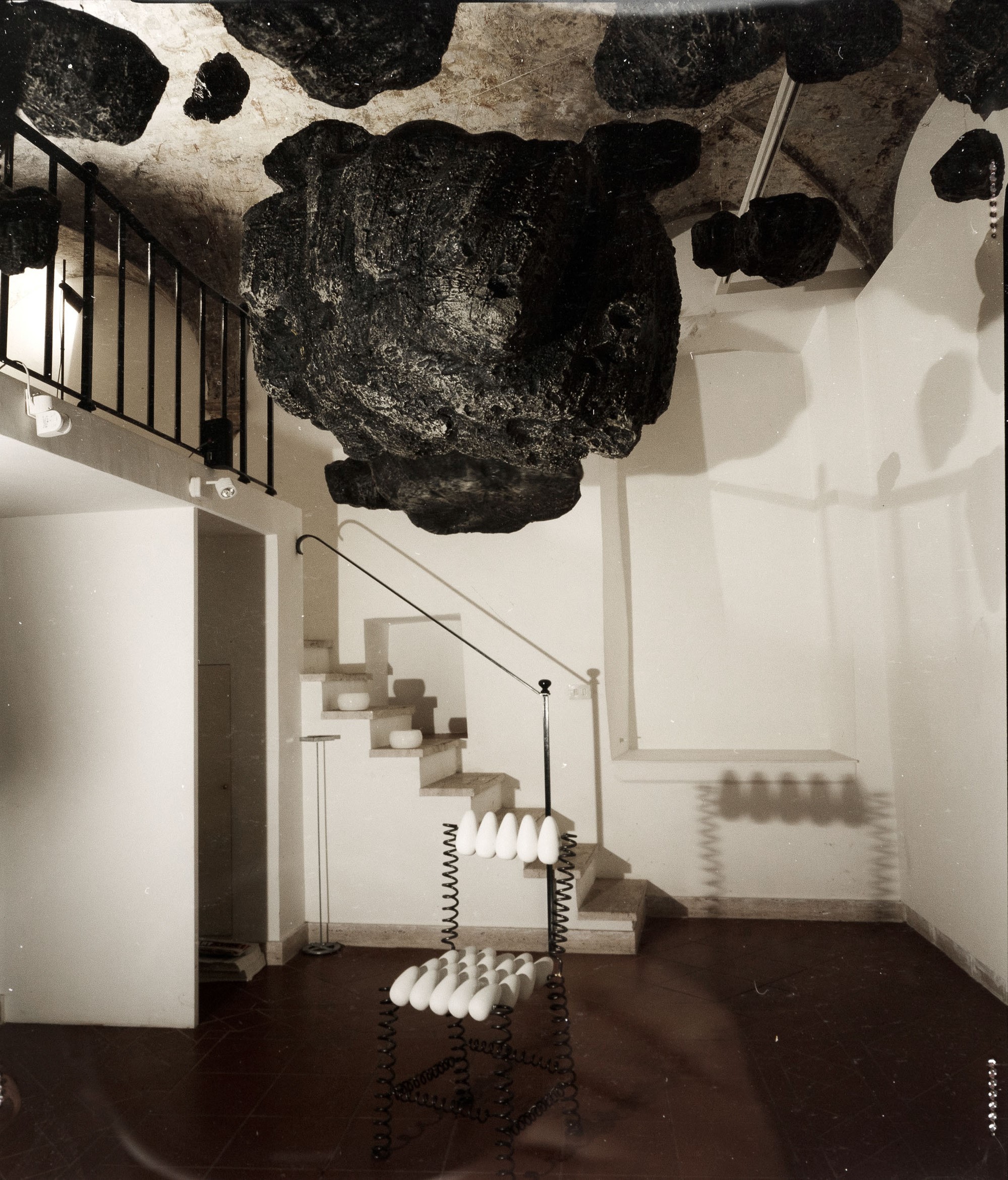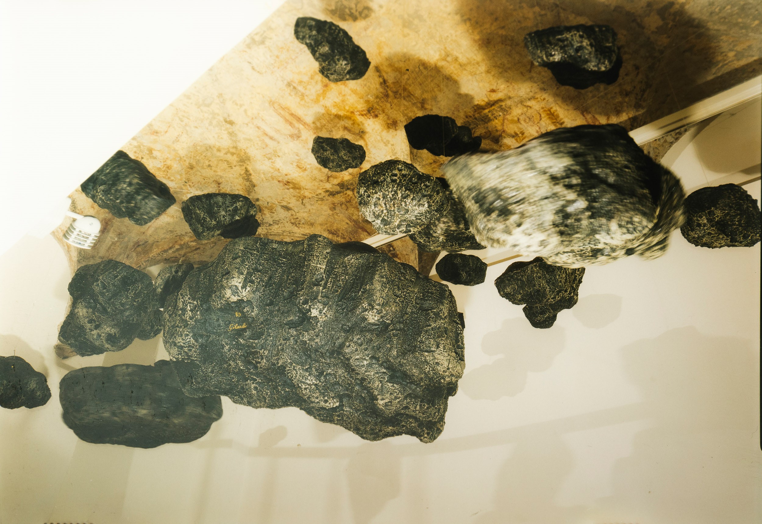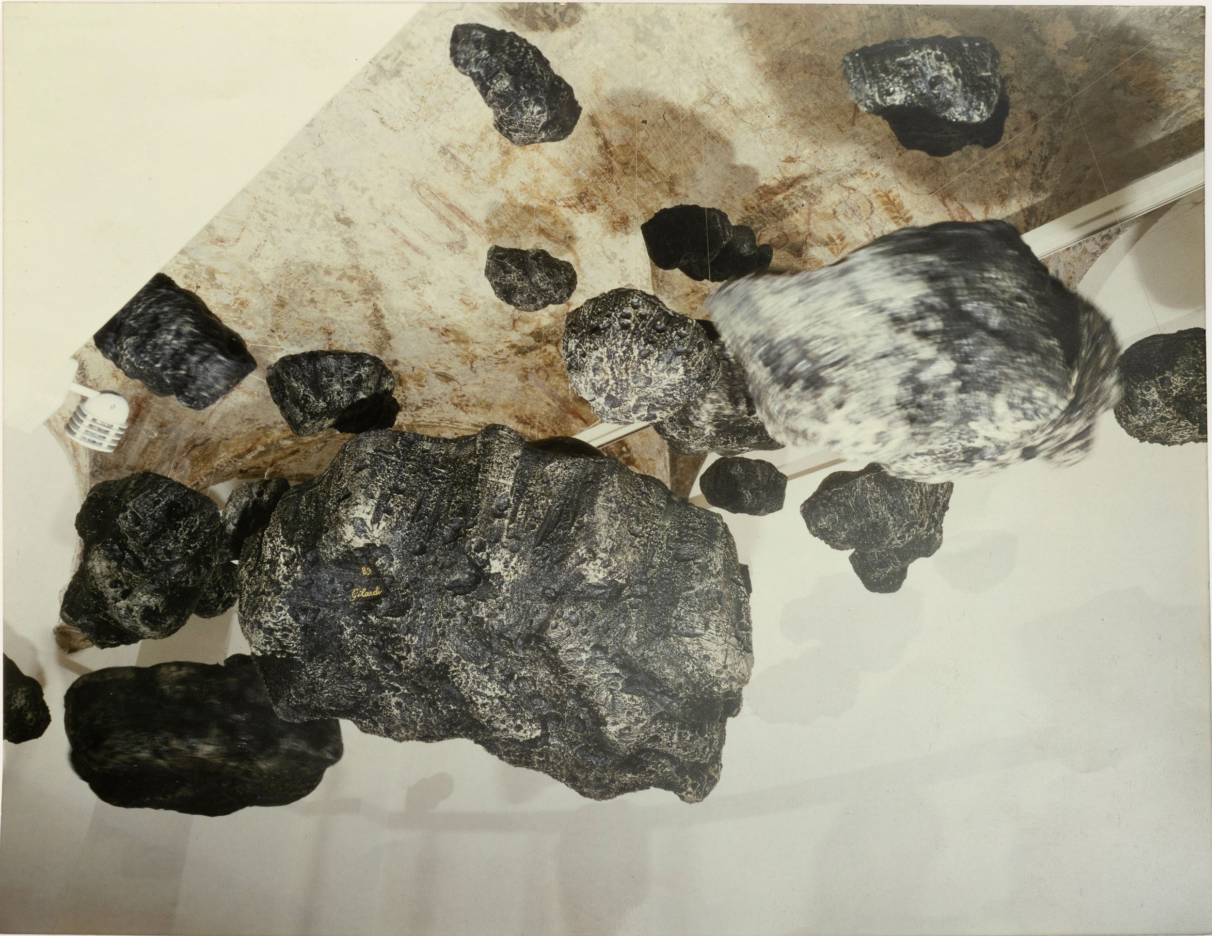 In un'epoca in cui la vicinanza con lo spazio celeste è diventata parte del quotidiano, questi sassi piovuti dal cielo ed esibiti dentro sicure bacheche nei maggiori musei del mondo appaiono meno minacciosi. Ma basta fermarsi un attimo a riflettere sulle possibili origini di questi agglomerati di materie "altre", ad immaginare i luoghi da cui provengono (asteroidi dalle forme improbabili, pianeti desertici battuti da venti gelidi, supernove o nane bianche, costellazioni dai nomi poetici come il "Cigno" o la "Lira" , galassie lontane migliaia di anni luce, buchi neri senza fondo) che lentamente questi sassi grigi diventano ai nostri occhi inquietanti, quasi minacciosi. Mentre li osserviamo ci coglie una sorta di disagio: essi portano dentro di se l'immensità dell'universo. Credo che le meteoriti in poliuretano espanso di Pietro Gilardi sospese a mezz'aria tra cielo e terra, intendano recuperare la dimensione sacrale delle "pietre di luce" dei Dayachi, basato appunto su questa sorta di spaesamento, di contatto con un infinito astrale e lontano ma nello stesso tempo ben radicato nell'immaginario collettivo.