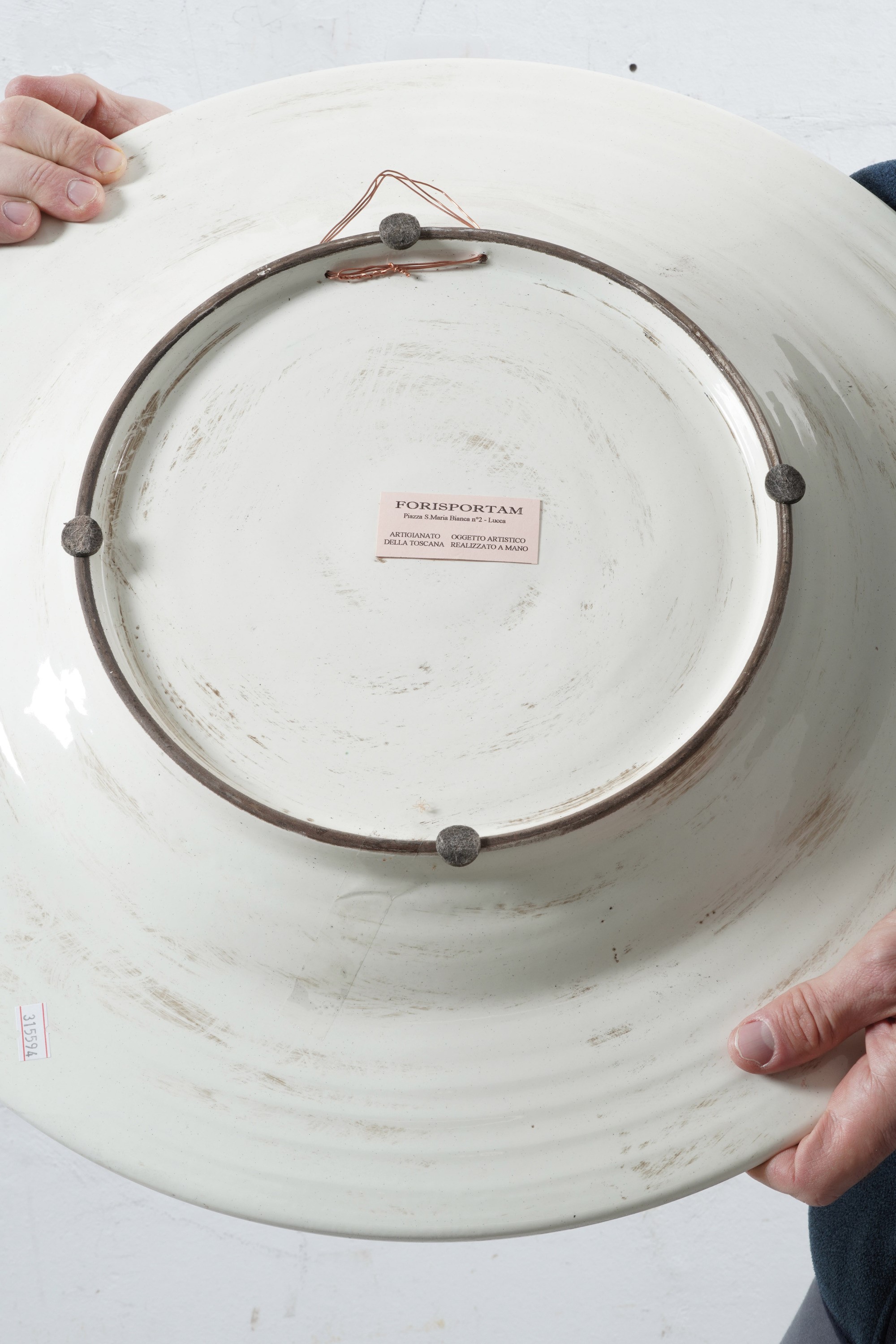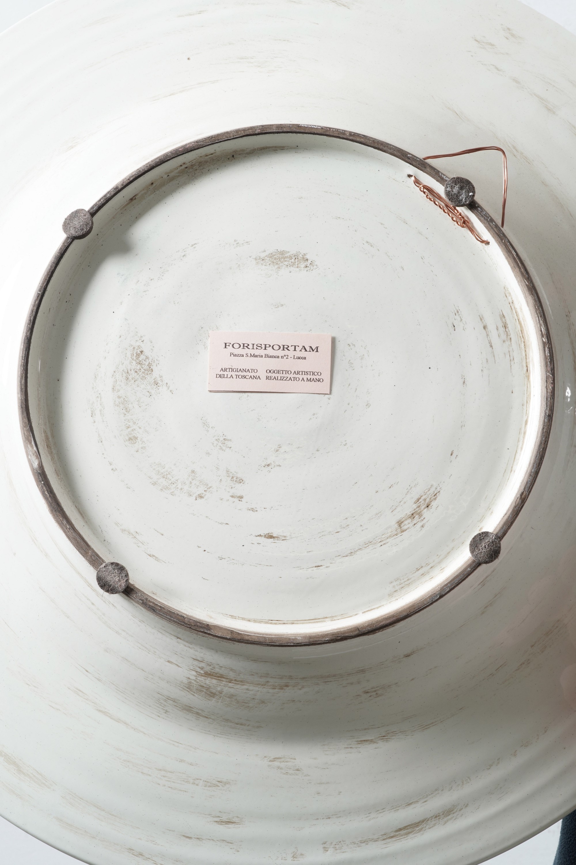 Maiolica d'ispirazione quattrocentesca. Marca: assente. Diametro cm 52,5. Conservazione: ottima.