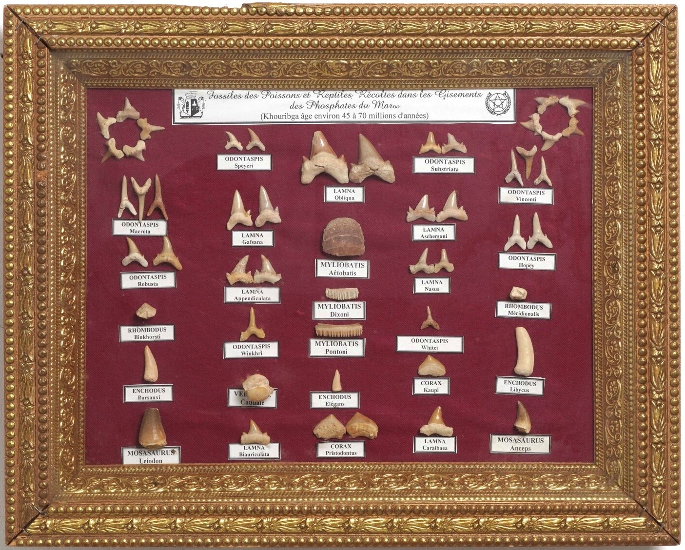 Cornice con vasta varietà di denti fossili