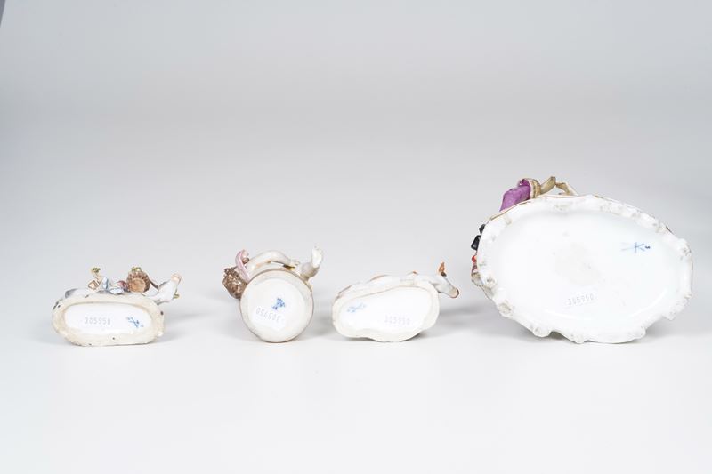 Porcellana. Altezza massima cm 24; altezza minima cm 7,6. Conservazione: cinque putti con piccole mancanze e una mano incollata; piccole mancanze minori; la coppia galante con qualche vecchio restauro e mancanze.