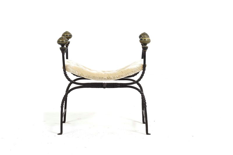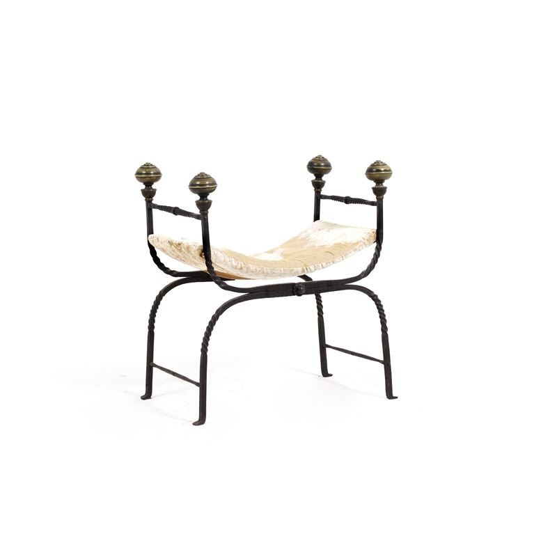 Faldistorio in ferro battuto con pomelli in ottone torniti. Italia centrale, XVI secolo