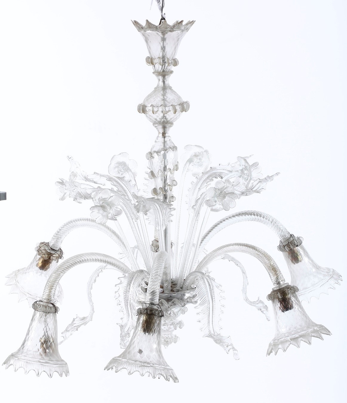 A sei luci, bracci mossi, paralumi a campana, elementi decorativi a foglie e fiori