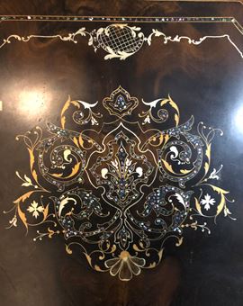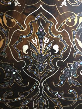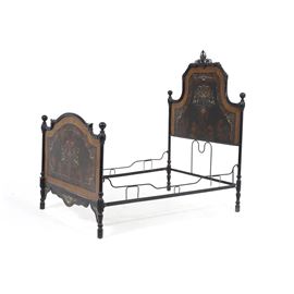 Testiera e pediera decorate con fregi dipinti ed elaborati decori in madreperla, cimasa traforata
