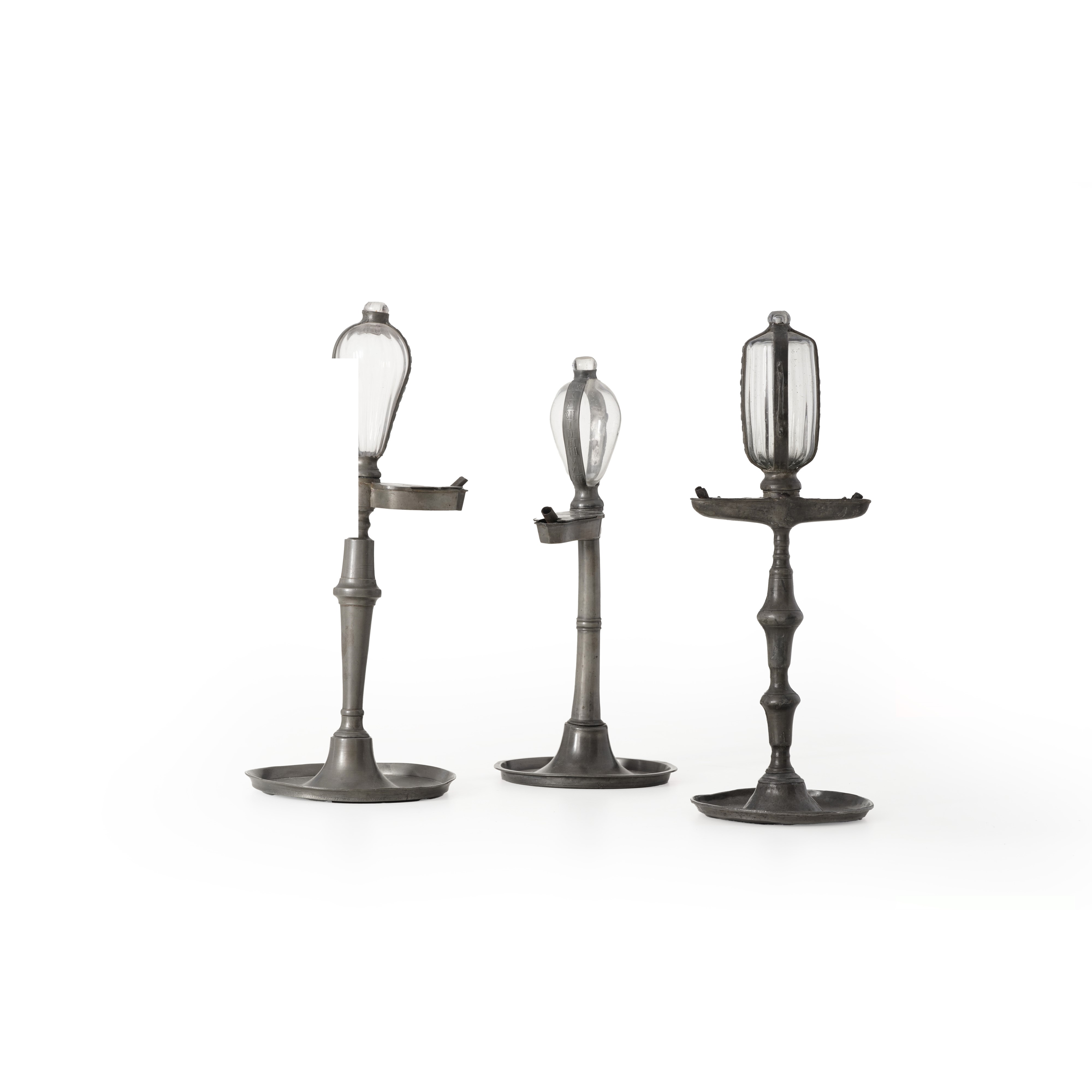 Lotto di tre lucerne in peltro e vetro. XVIII secolo