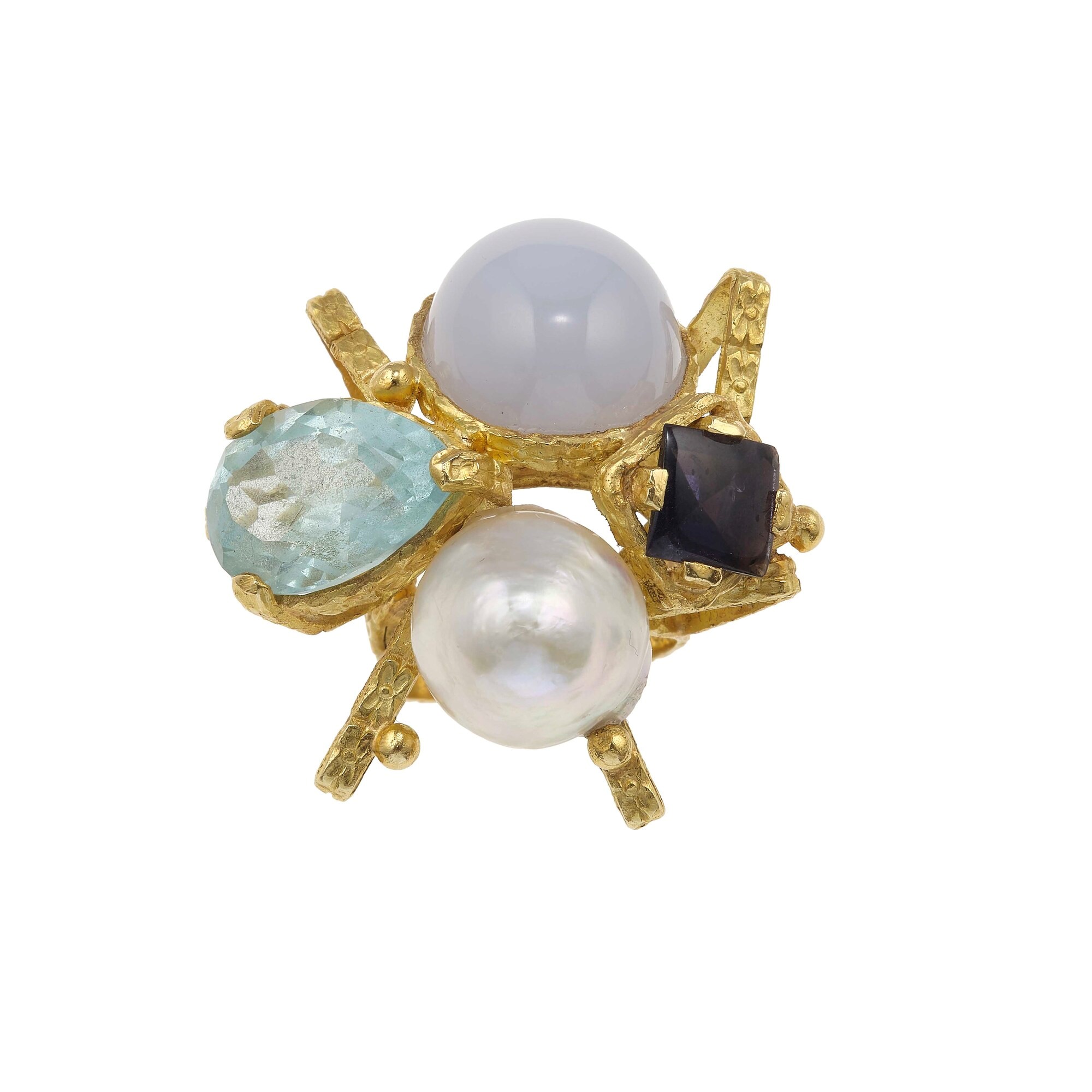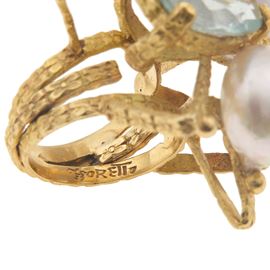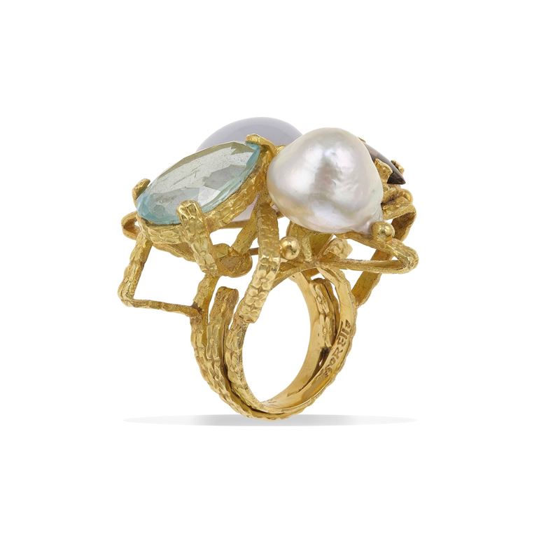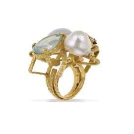 Anello con perla, topazio azzurro, tanzanite e clair de lune
