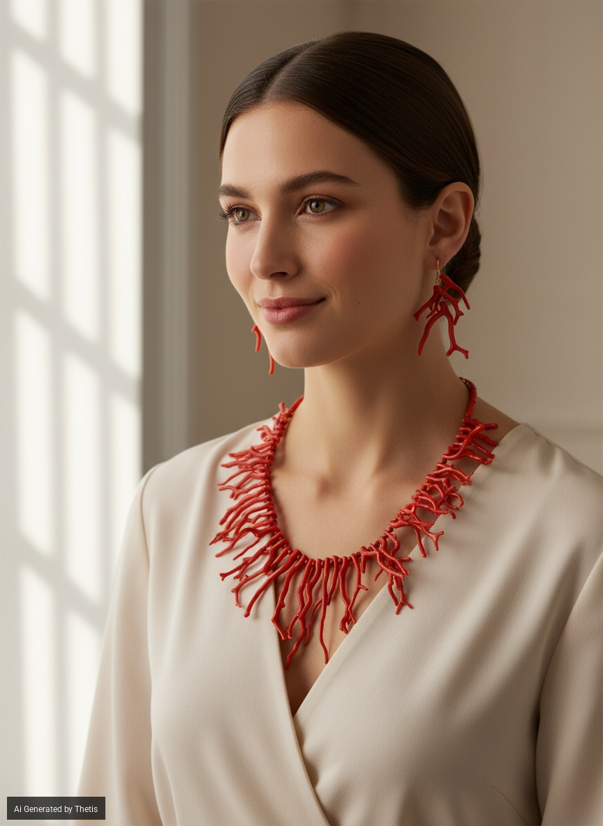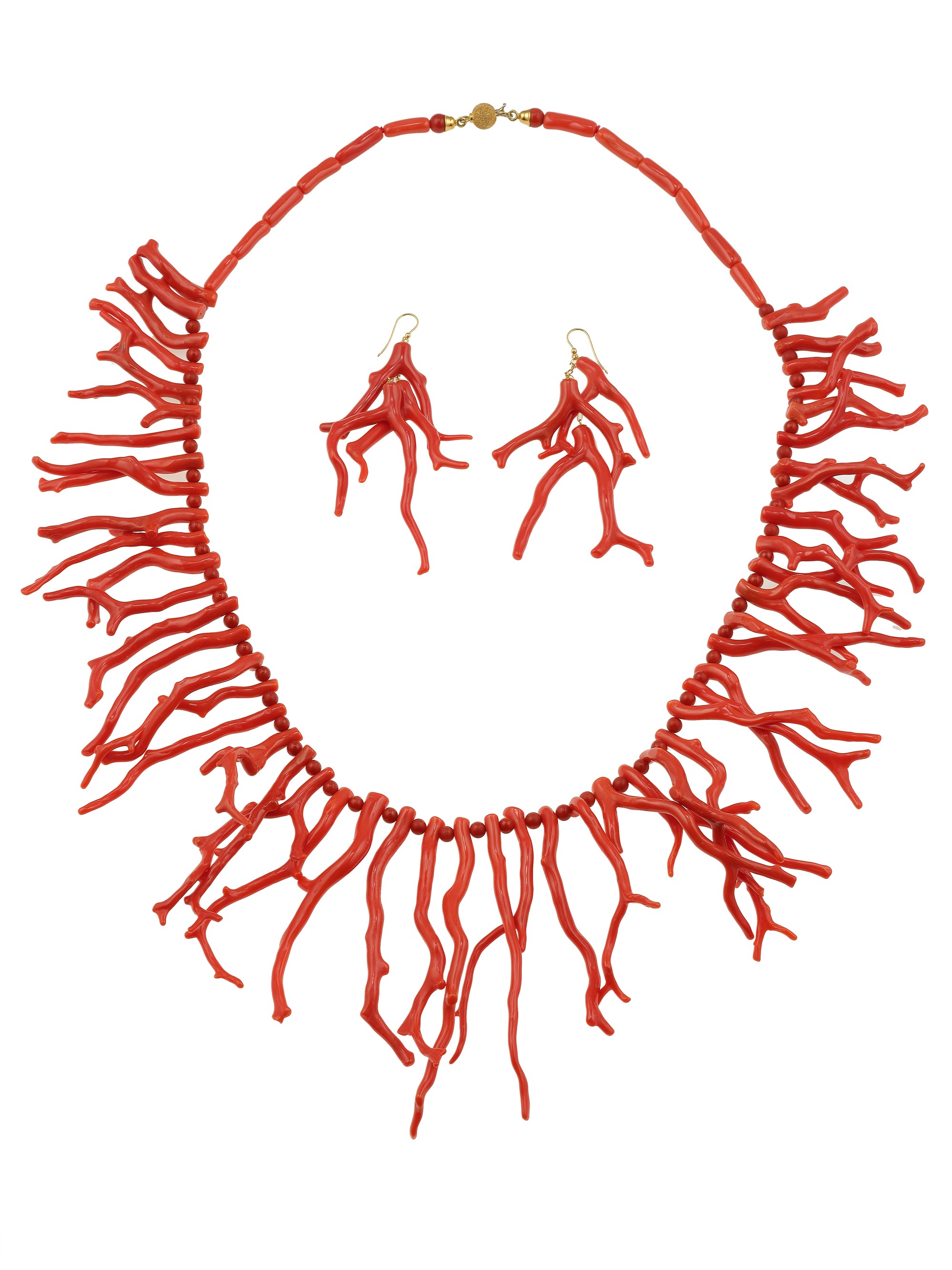 Demi-parure composta da collana ed orecchini con rametti di corallo