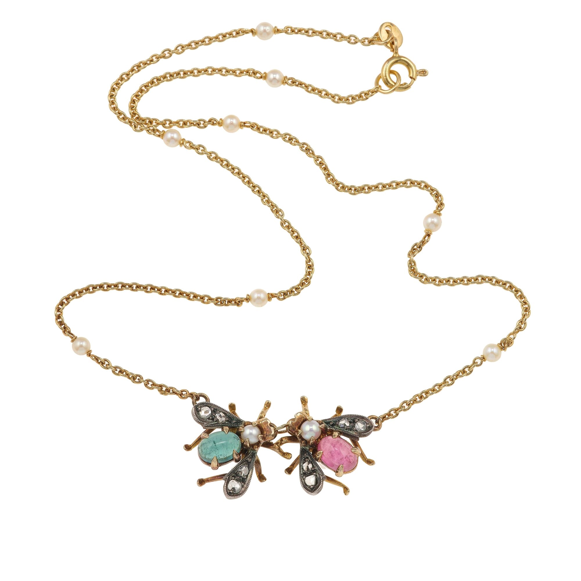 Girocollo "mosche" con tormaline taglio cabochon e piccole perle