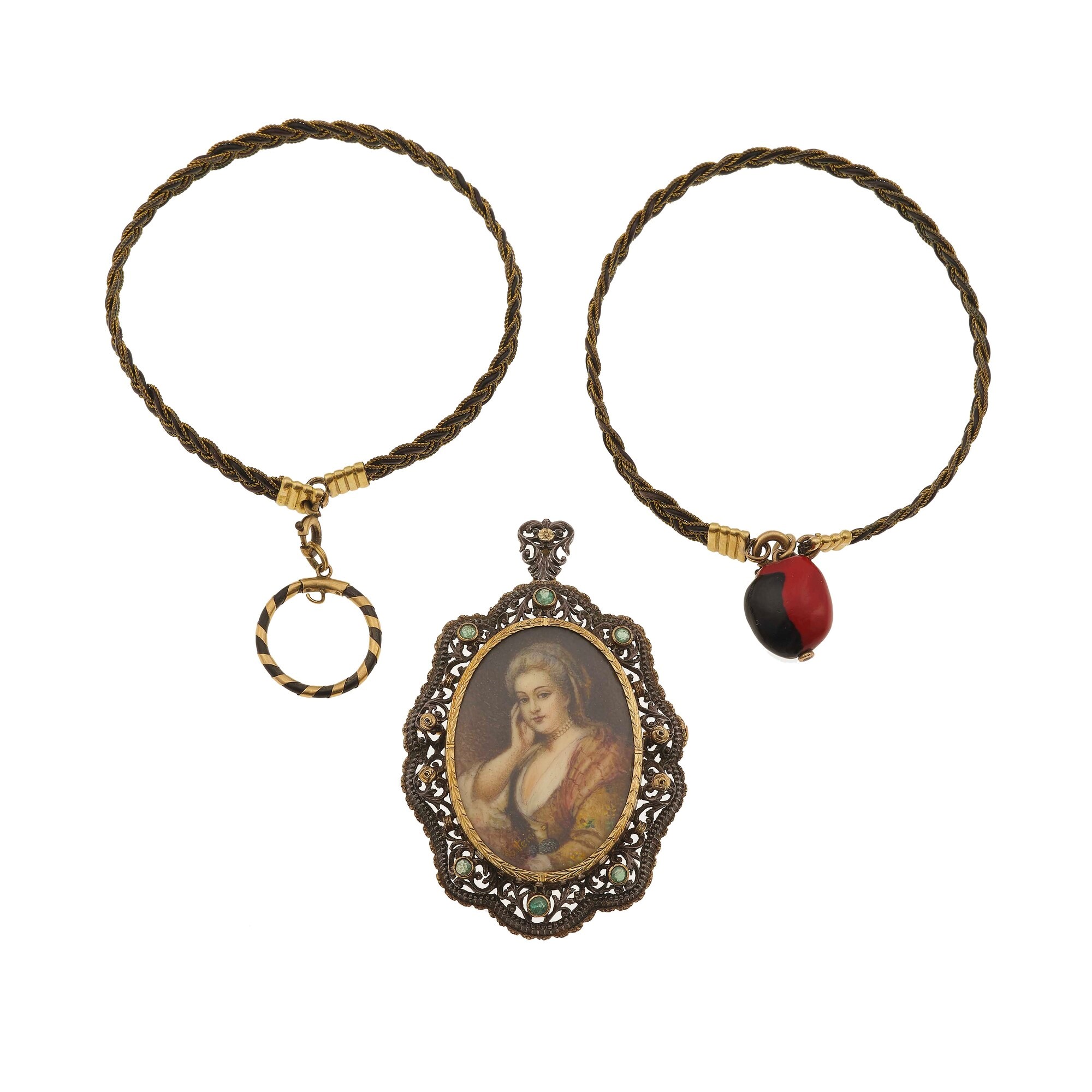 Lotto composto da due bracciali ed una spilla/pendente con miniatura e piccoli smeraldi