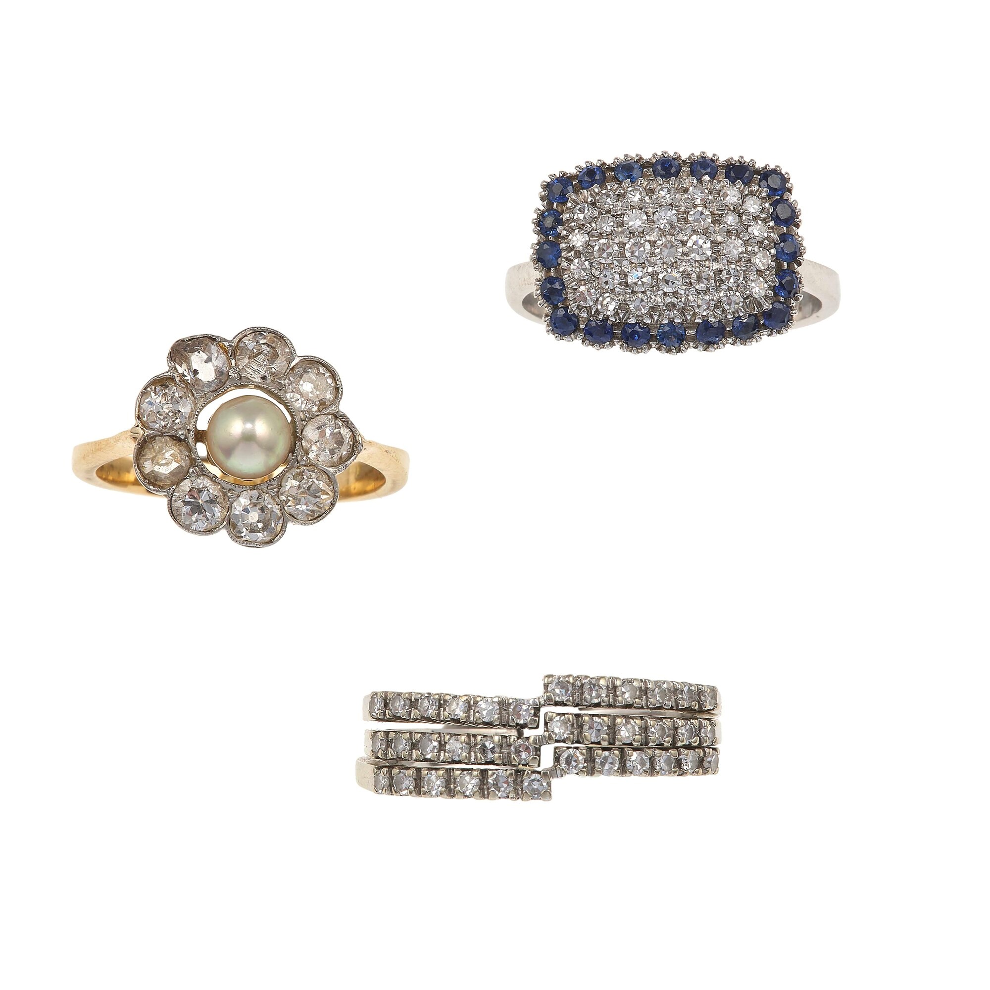 Lotto composto da tre anelli con diamanti, zaffiri e perla