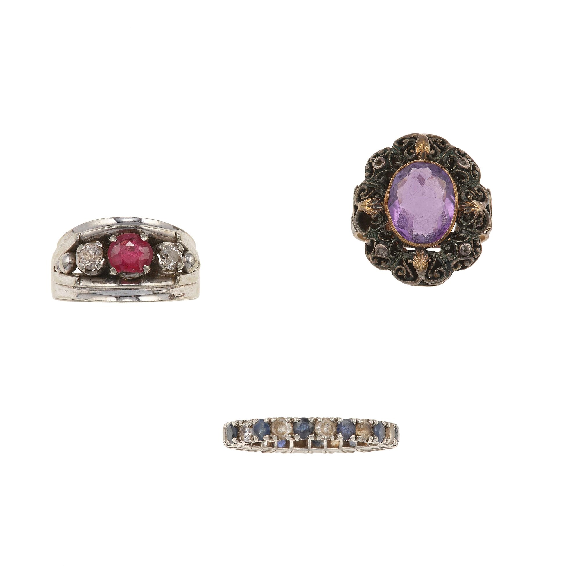 Lotto composto da tre anelli con pietre sintetiche e piccoli diamanti