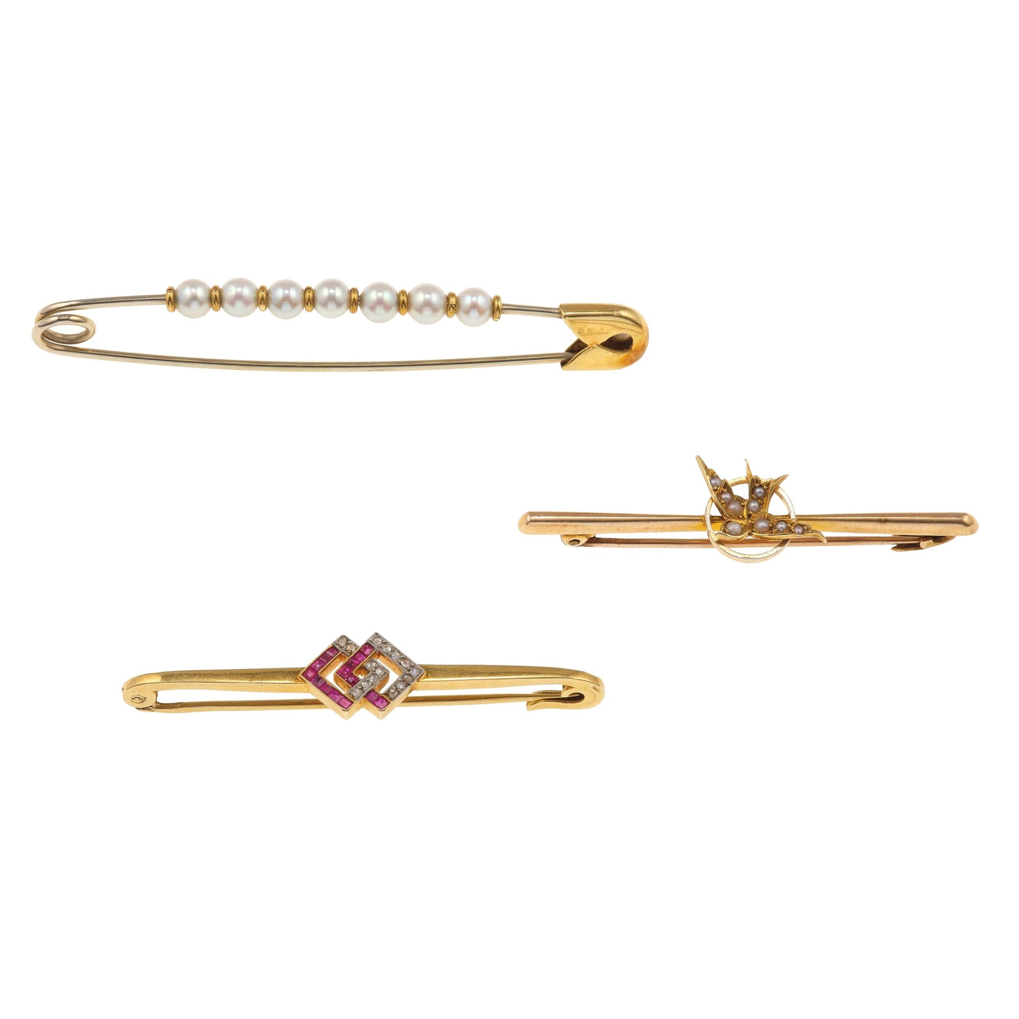 Lotto composto da tre spille con piccoli diamanti, rubini e perle