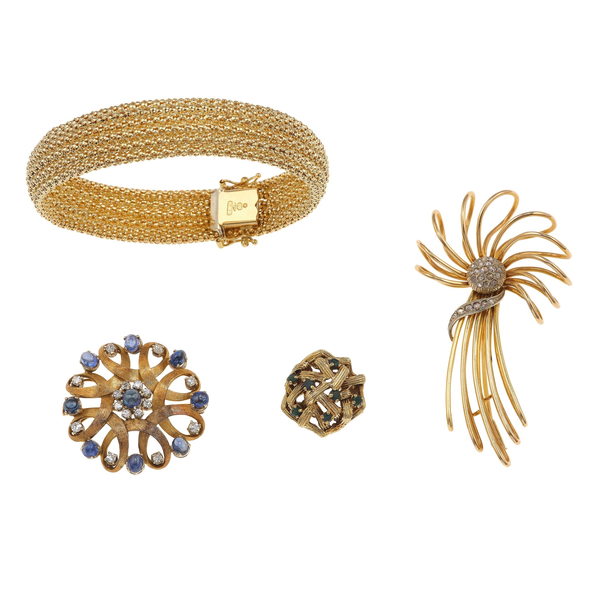 Lotto composto da un bracciale semirigido, due spille ed un anello con diamanti e zaffiri
