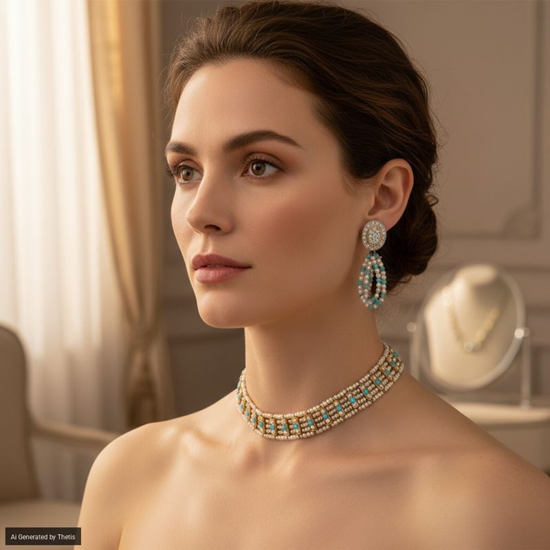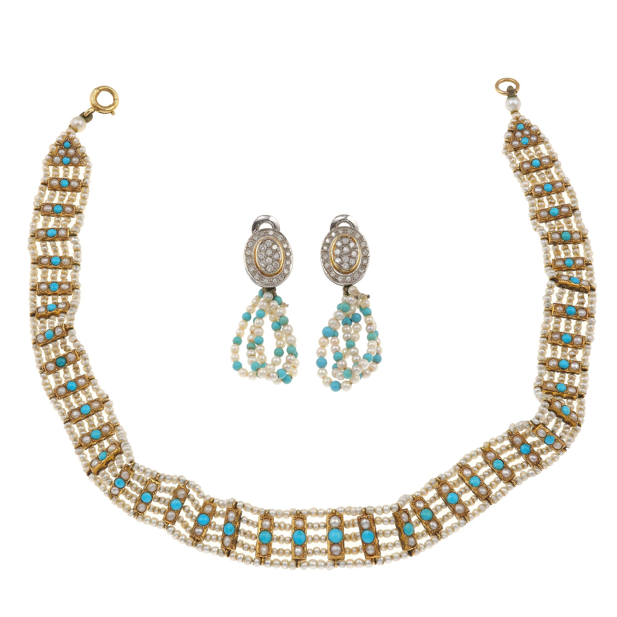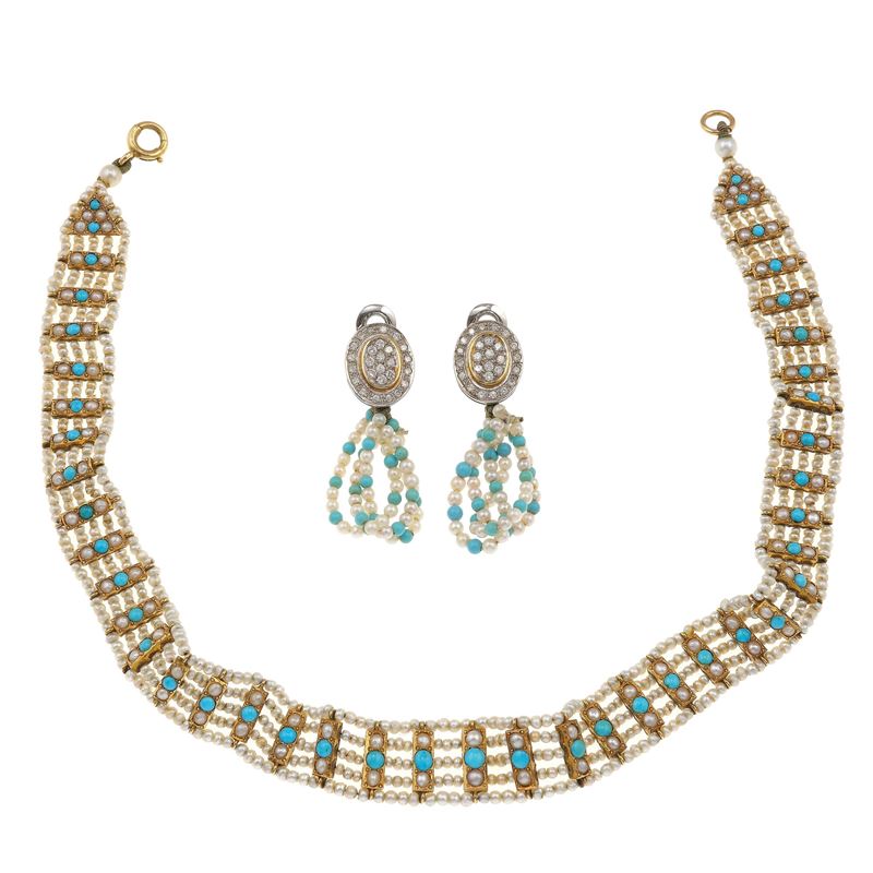 Lotto composto da un choker e un paio di orecchini con piccole perle, turchesi e diamanti