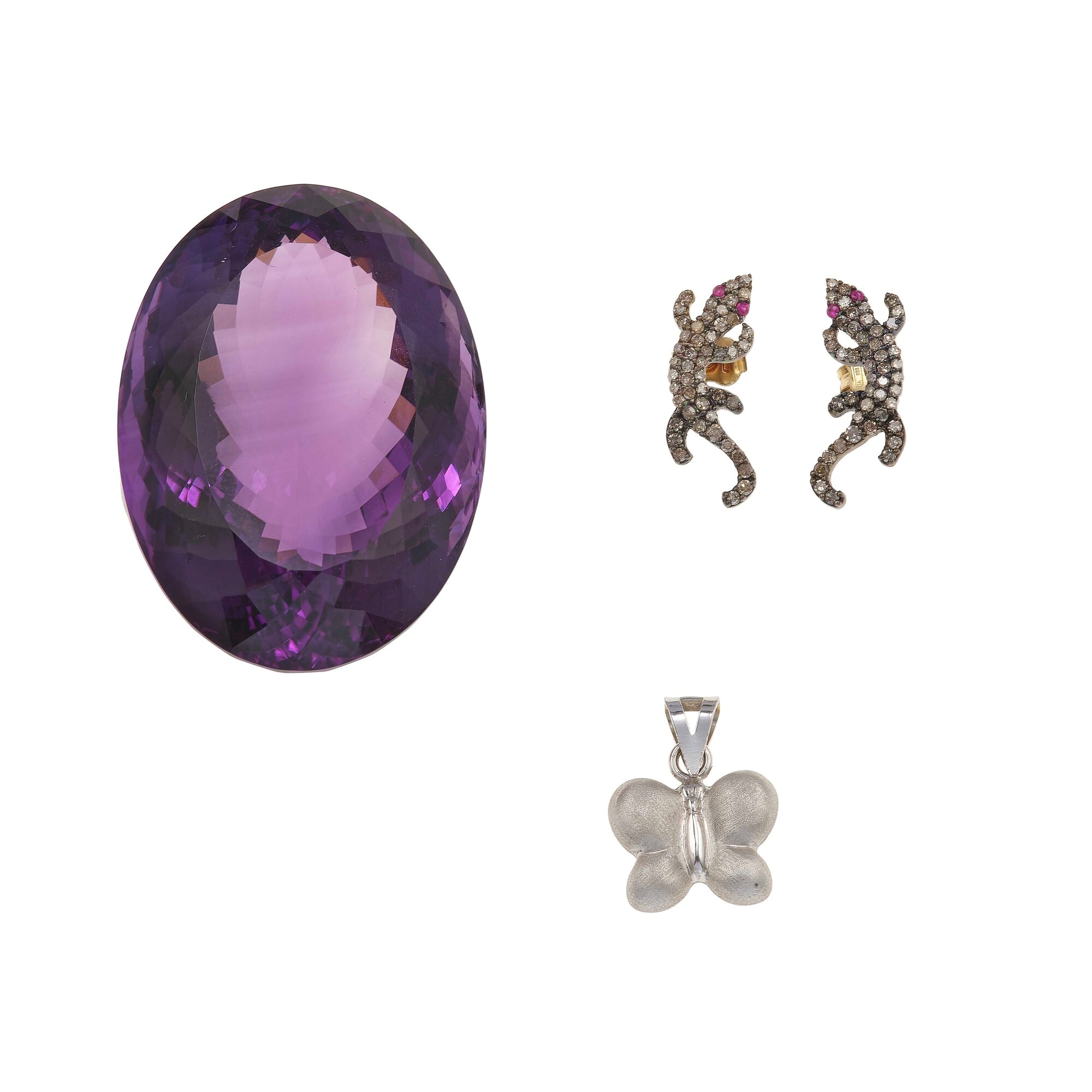 Lotto composto da un pendente "Farfalla", un paio di orecchini "Geco" ed una grande ametista taglio briolette