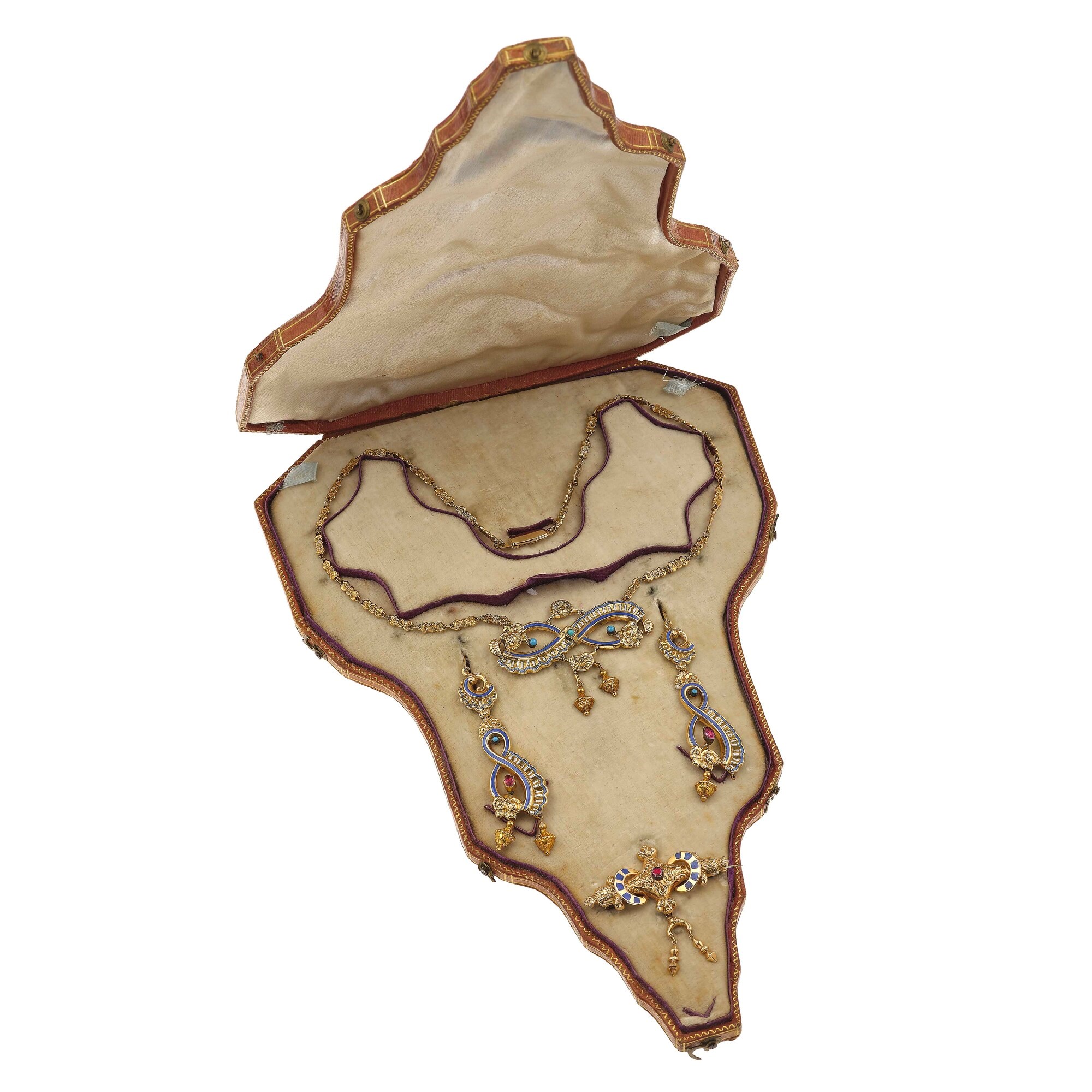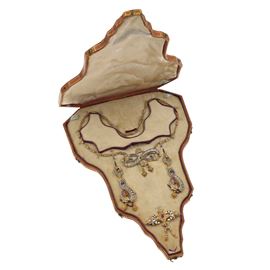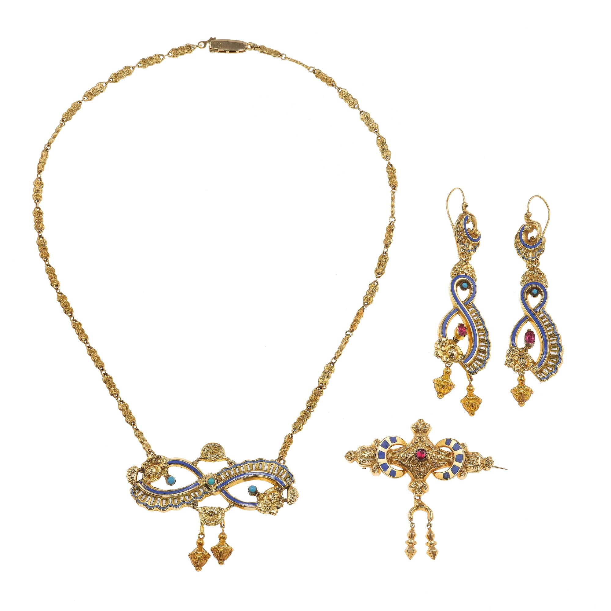 Parure composta da girocollo, orecchini e spilla con smalti policromi e paste vitree