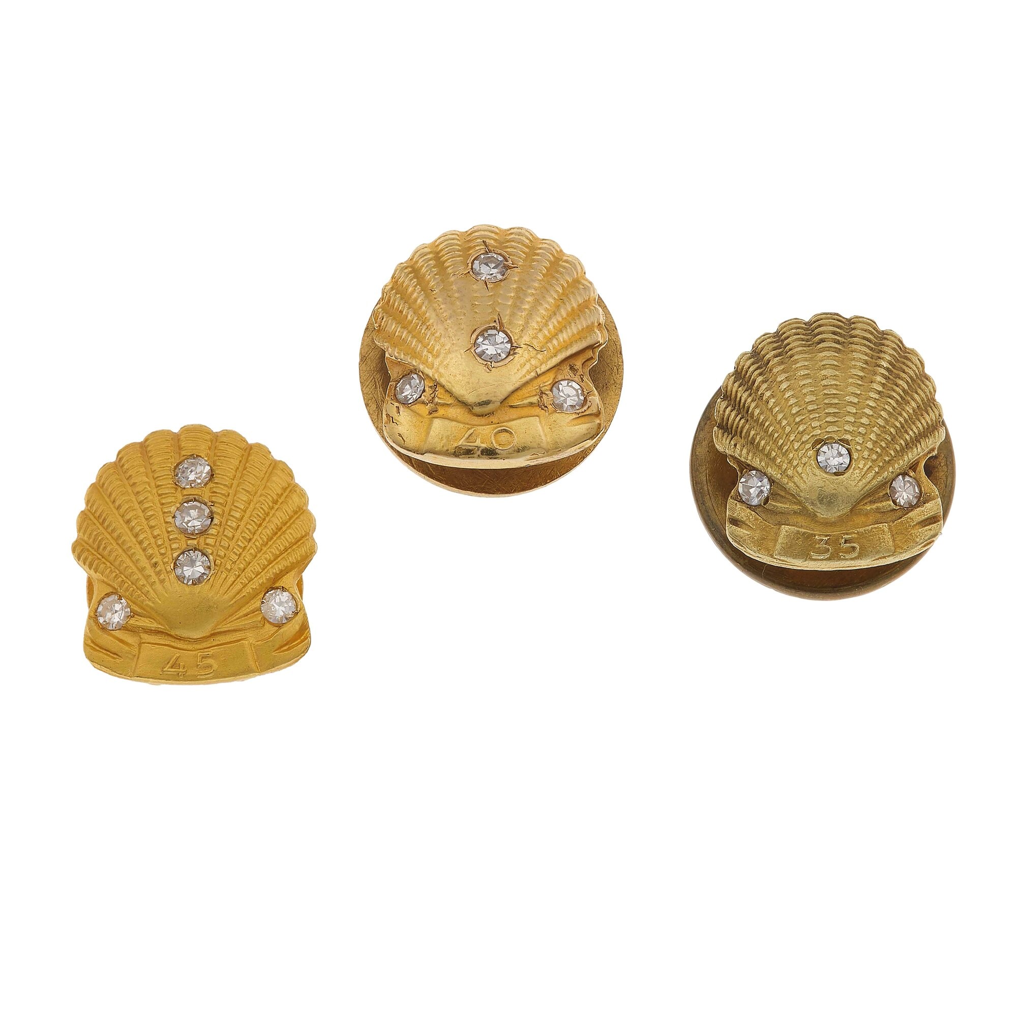 Pisano, Genova. Tre spille da bavero "Shell" con piccoli diamanti taglio huit-huit