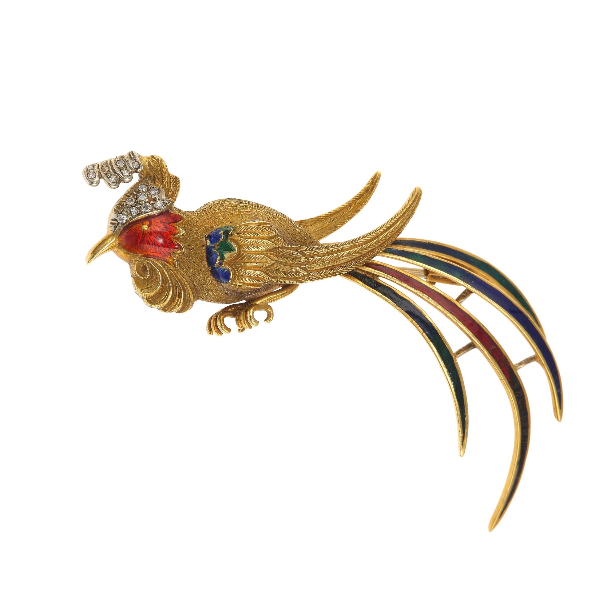 Spilla "Uccello del Paradiso" con smalti policromi e piccoli diamanti
