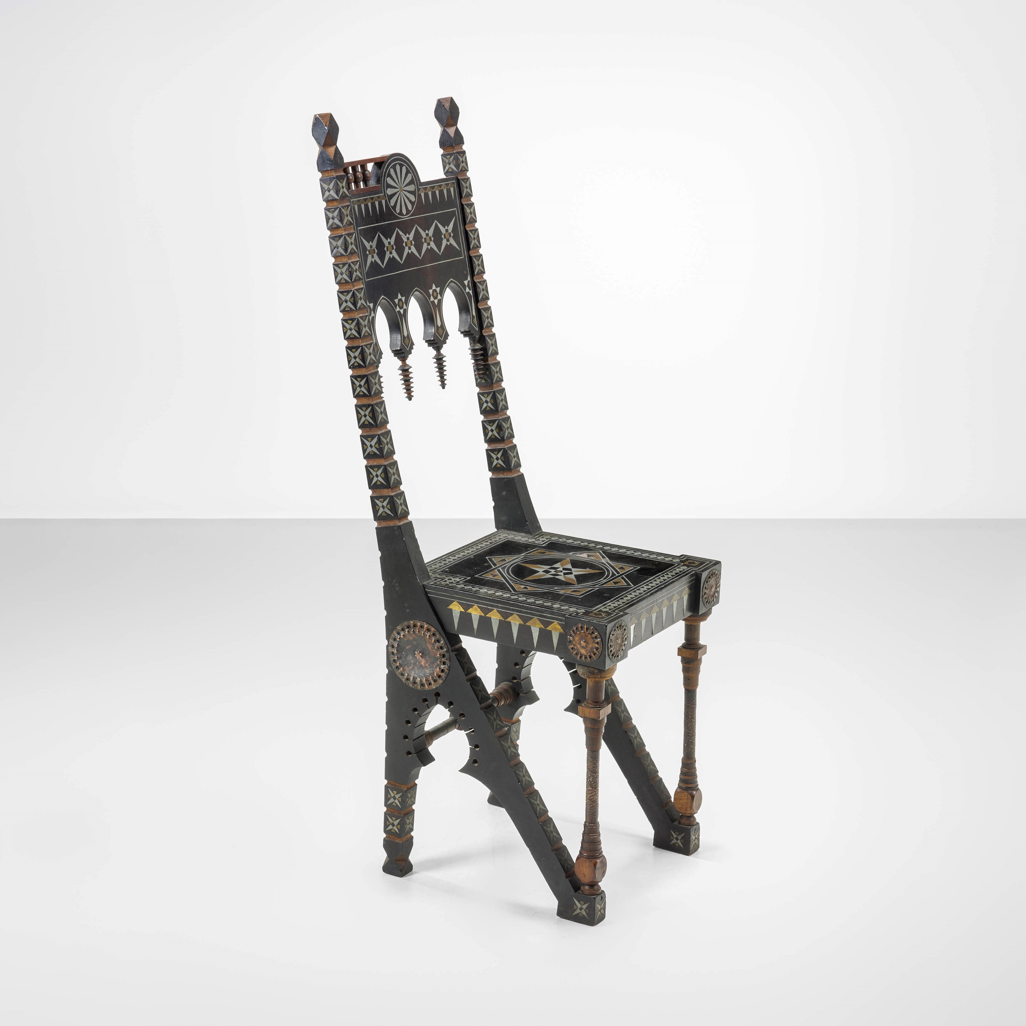 Struttura in legno e legno ebanizzato. Rivestimenti in pergamena. Applicazioni in rame sbalzato. Intarsi in metallo e ottone.