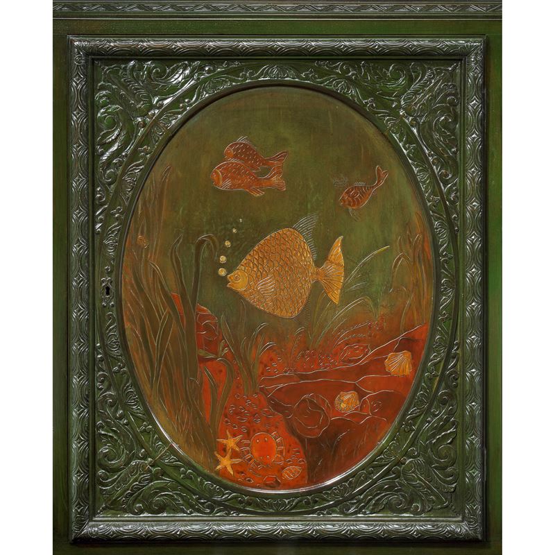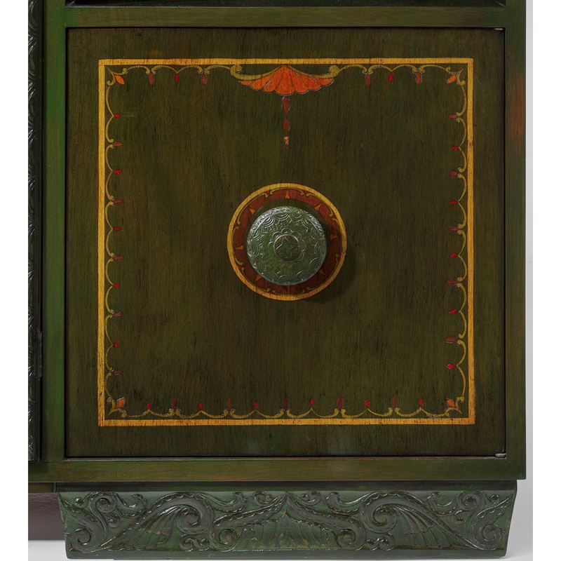 Struttura in legno verniciato all’anilina e legno intarsiato. Pannelli dipinti.