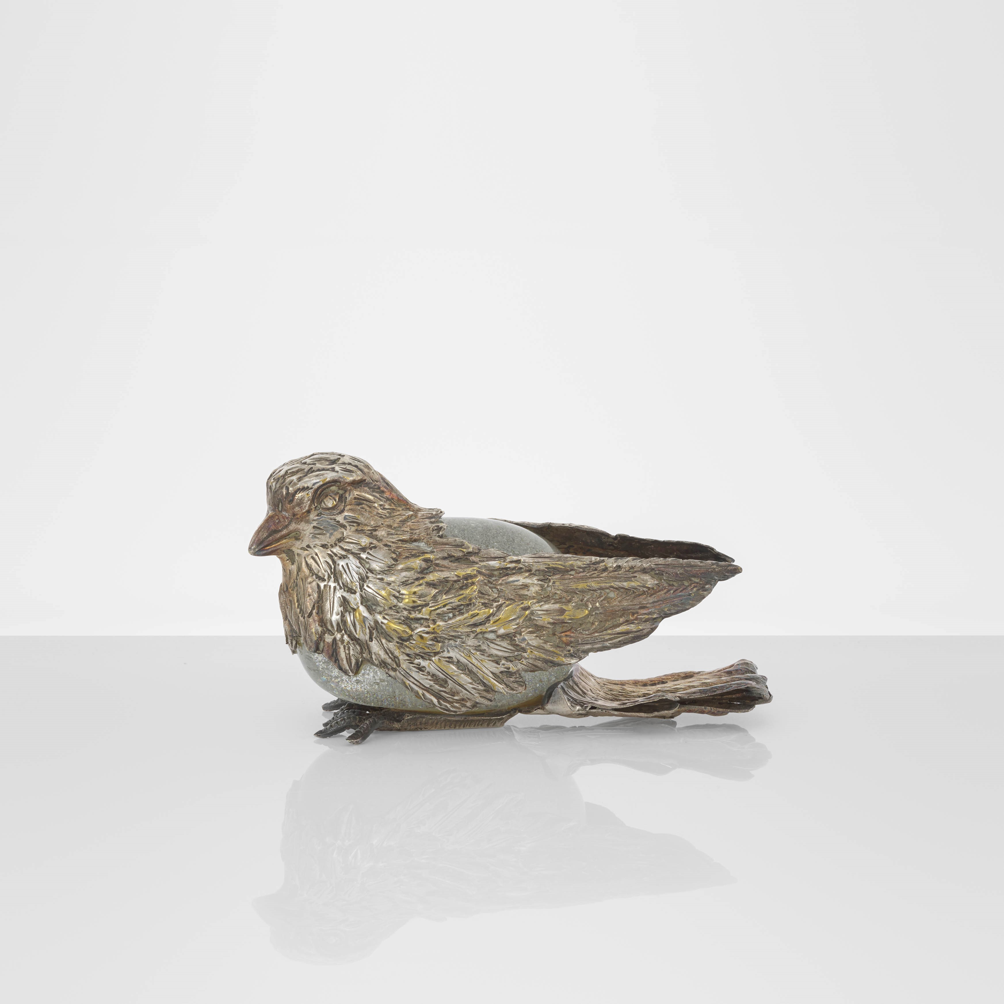 Scultura in metallo argentato cesellata a mano.