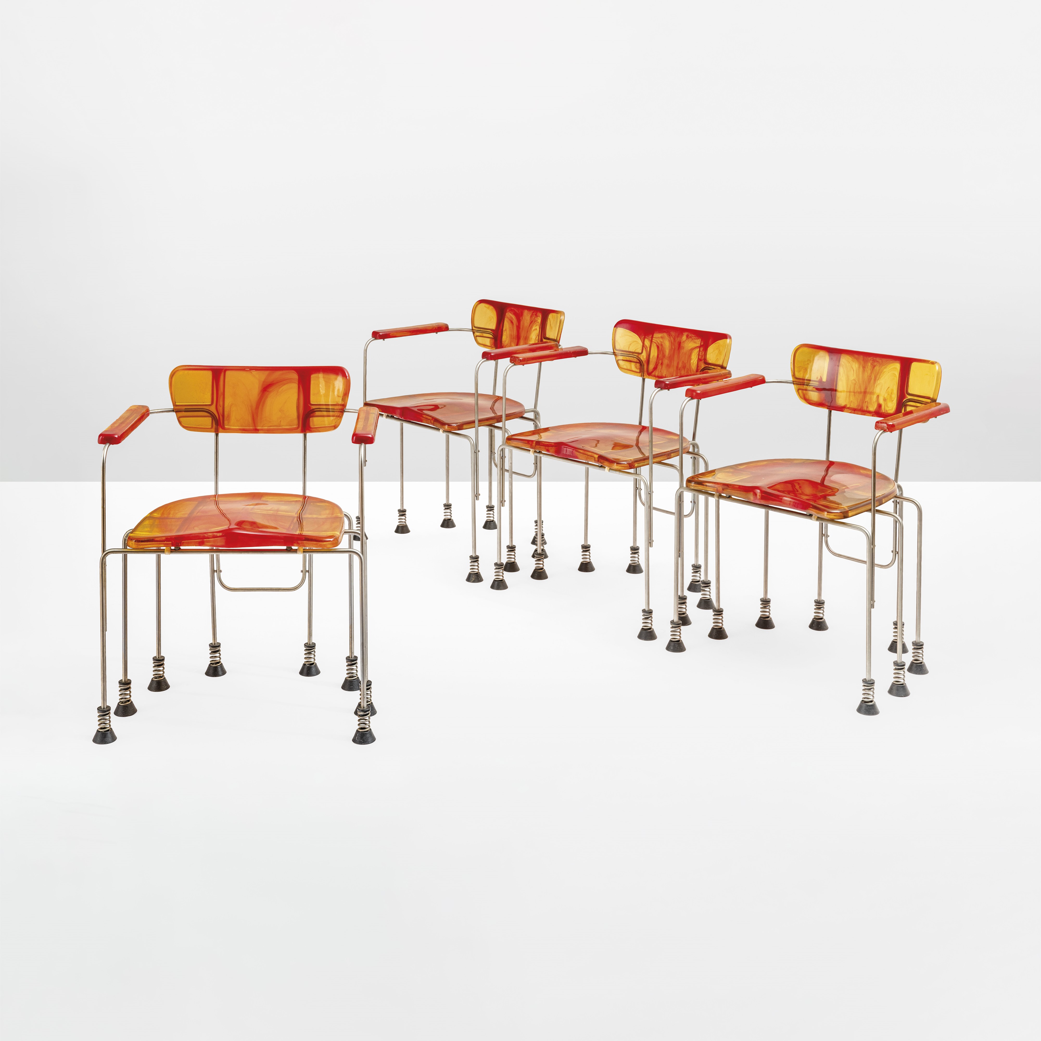 Struttura in acciaio cromato con seduta e schienale in resina epossidica.