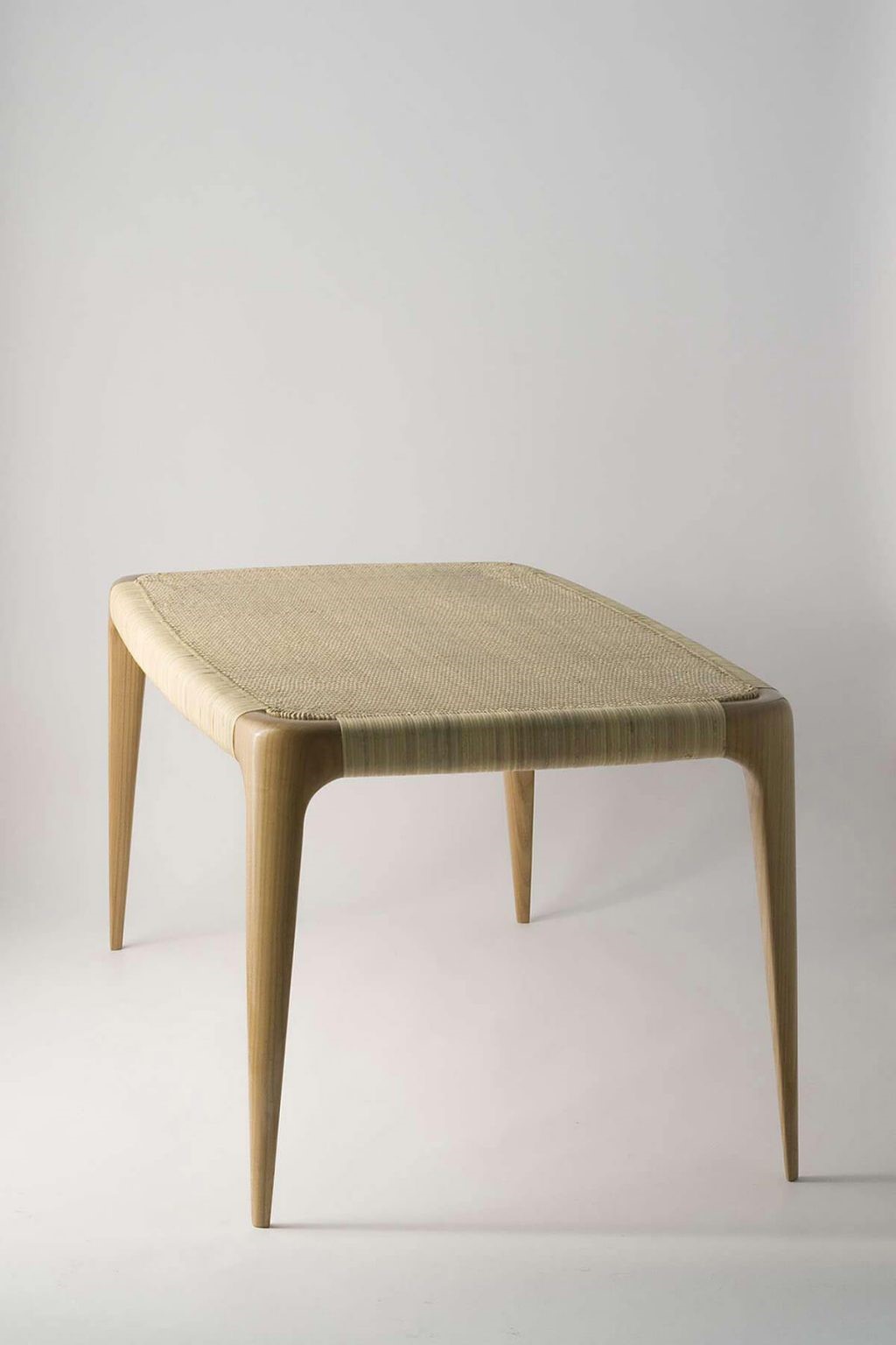 Tavolino Bone dal design organico ed essenziale. La complessa forma della gamba è lavorata interamente a mano. Piano in canna intrecciata con la tradizionale trama "chiavarina", struttura in ciliegio.