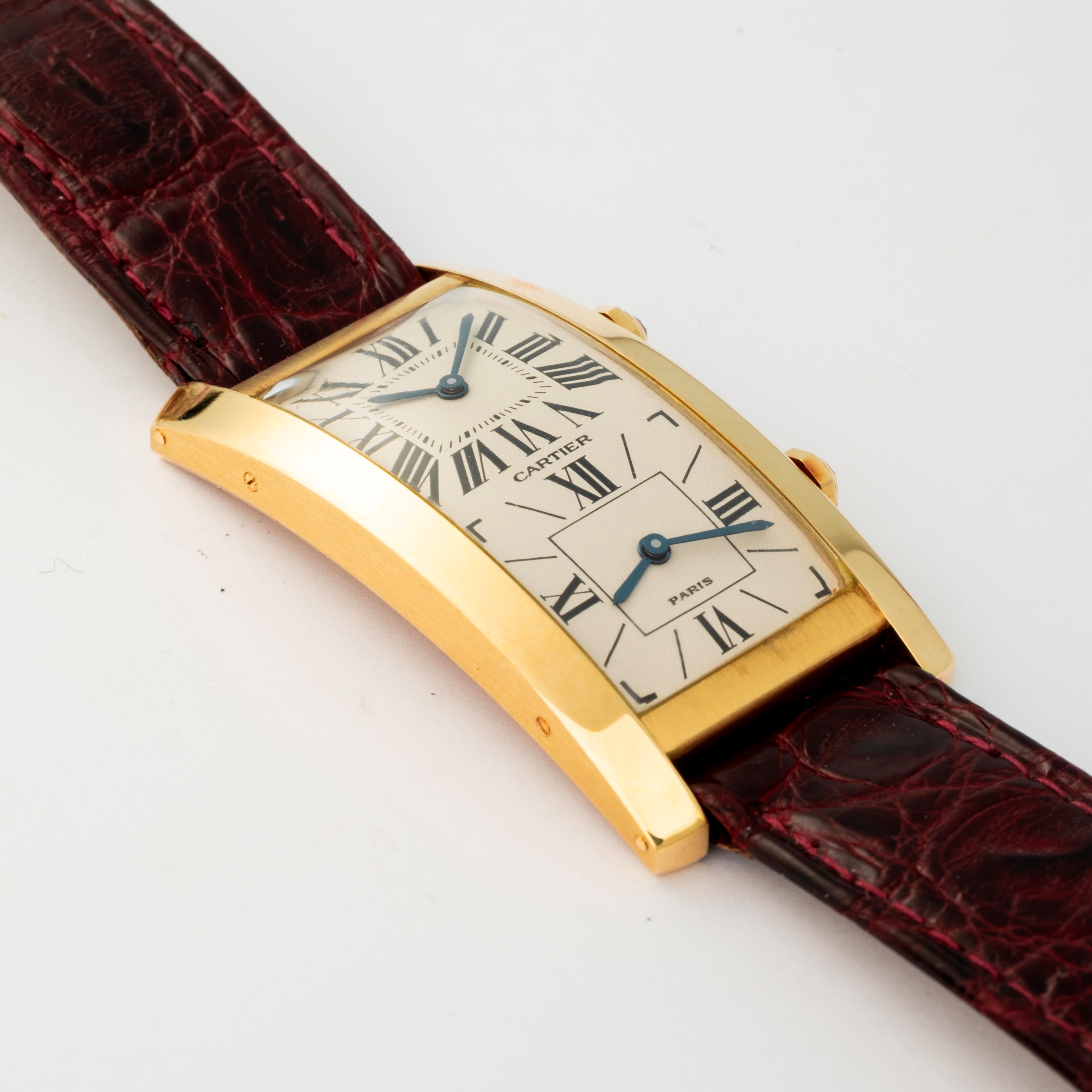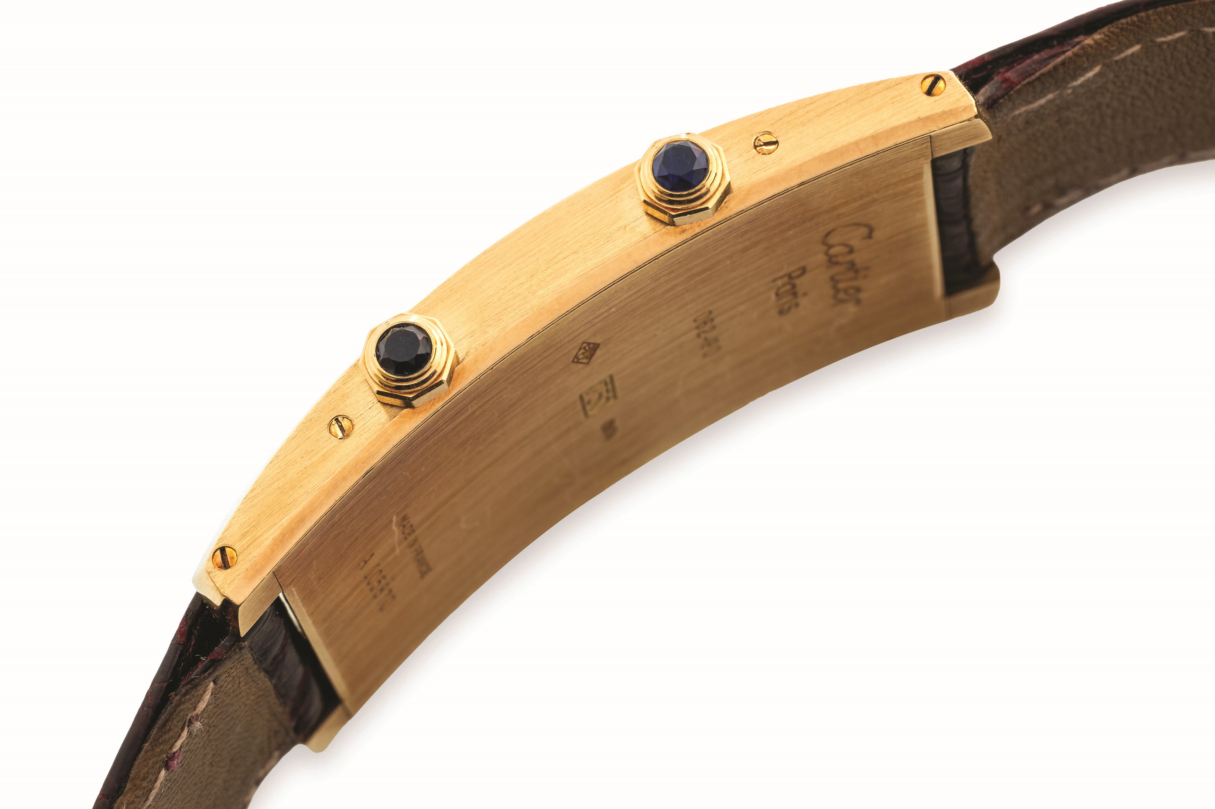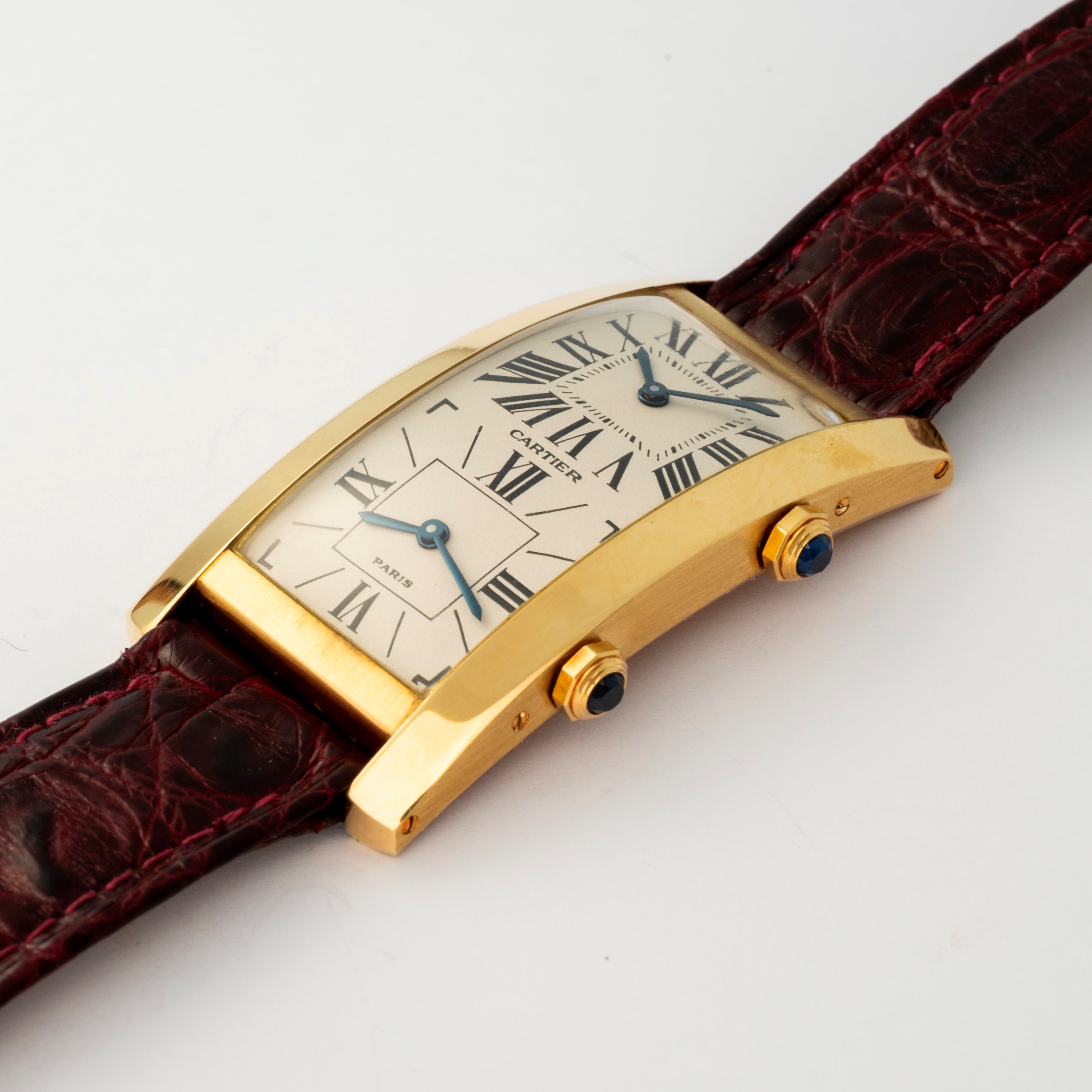Presentato nel 1990 e qui proposto nella sua raffinata versione in oro giallo, il Cartier Tank Cintrée Dual Time rappresenta una delle più originali interpretazioni del concetto Tank, con una filosofia progettuale che fonde audacia tecnica e puro design parigino.
