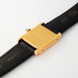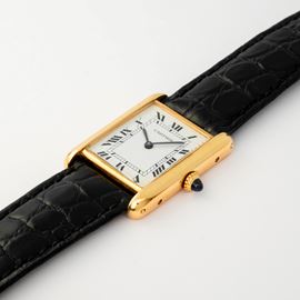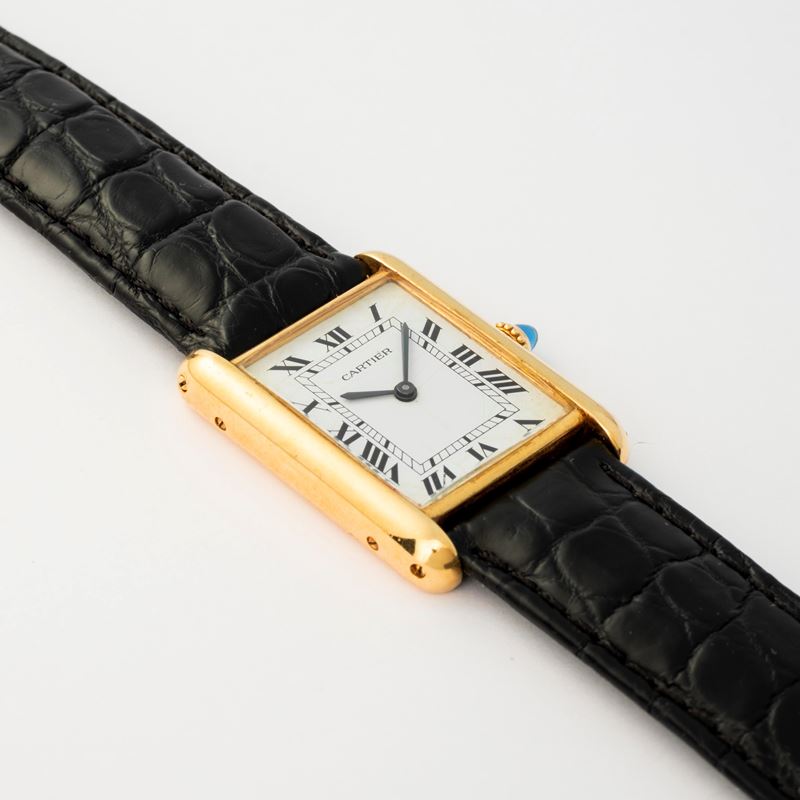 Tank Louis ref 78086 in oro giallo 18k, quadrante bianco con numeri romani, circa 1970