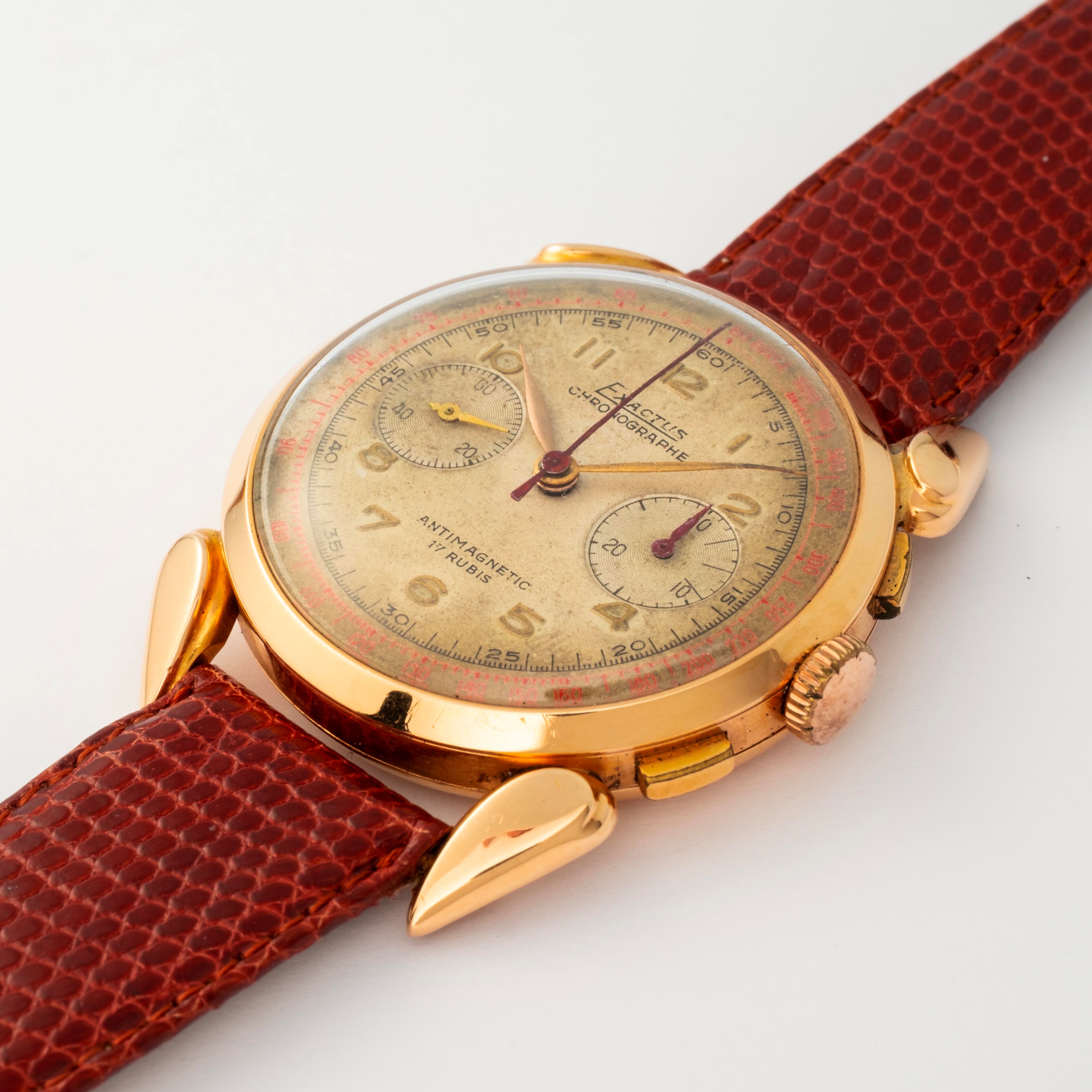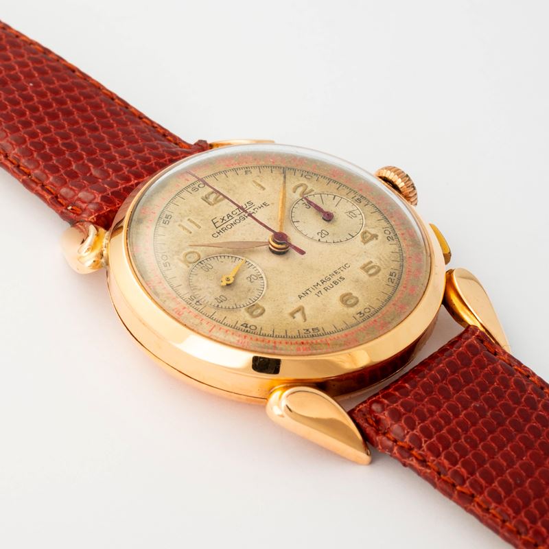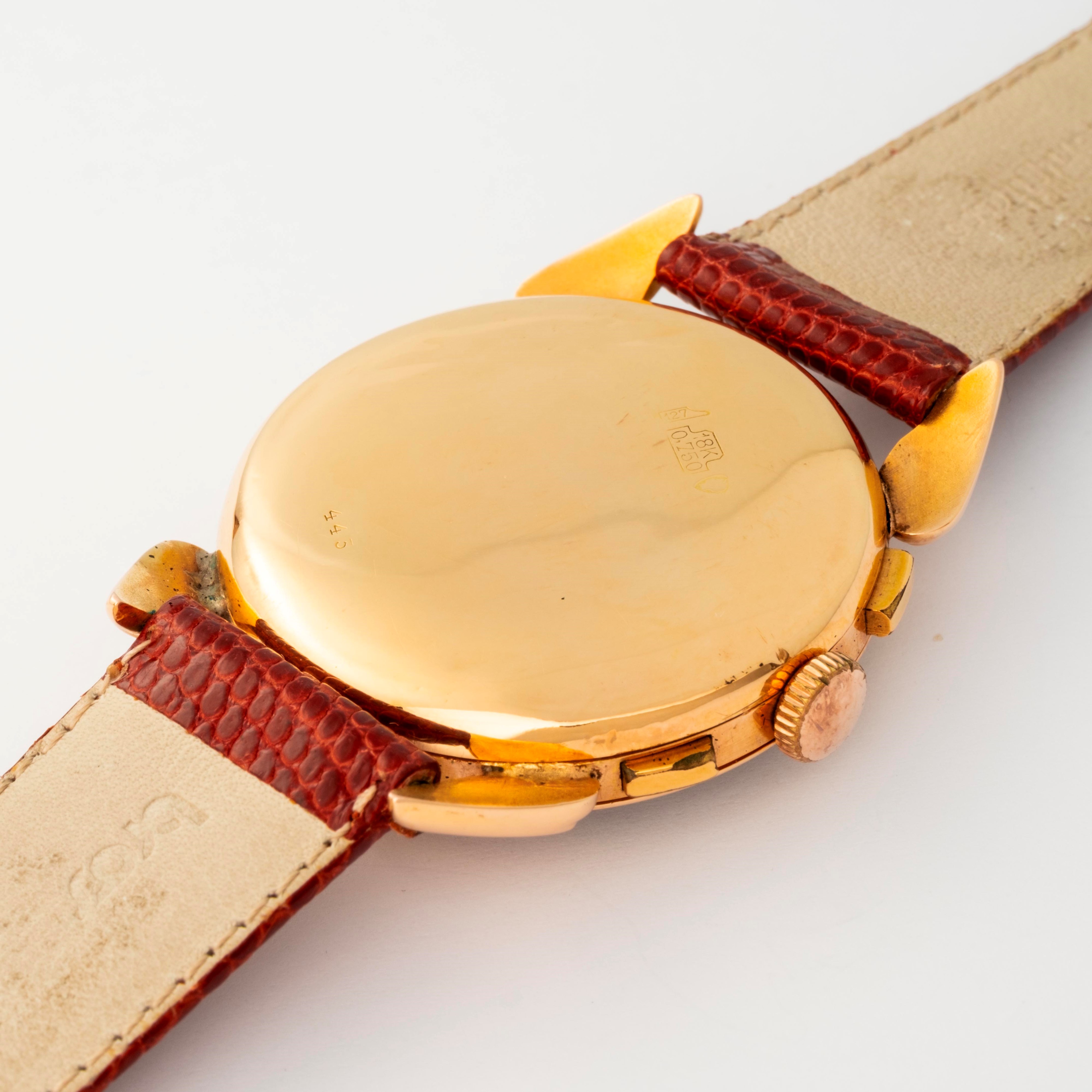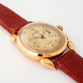 Corne de Vache cronografo in oro giallo 18k, con quadrante Grenè a due contatori, circa 1950
