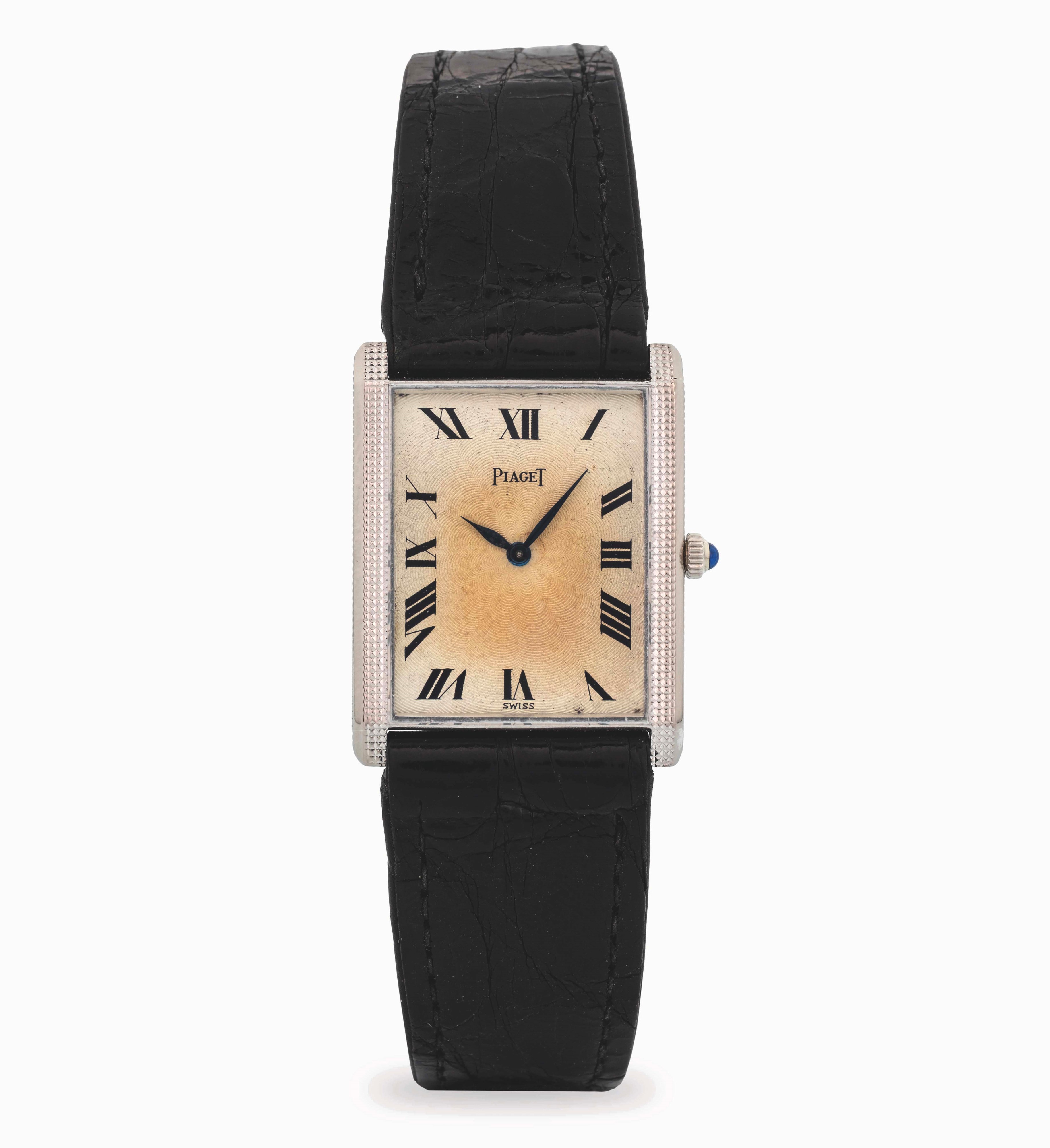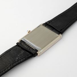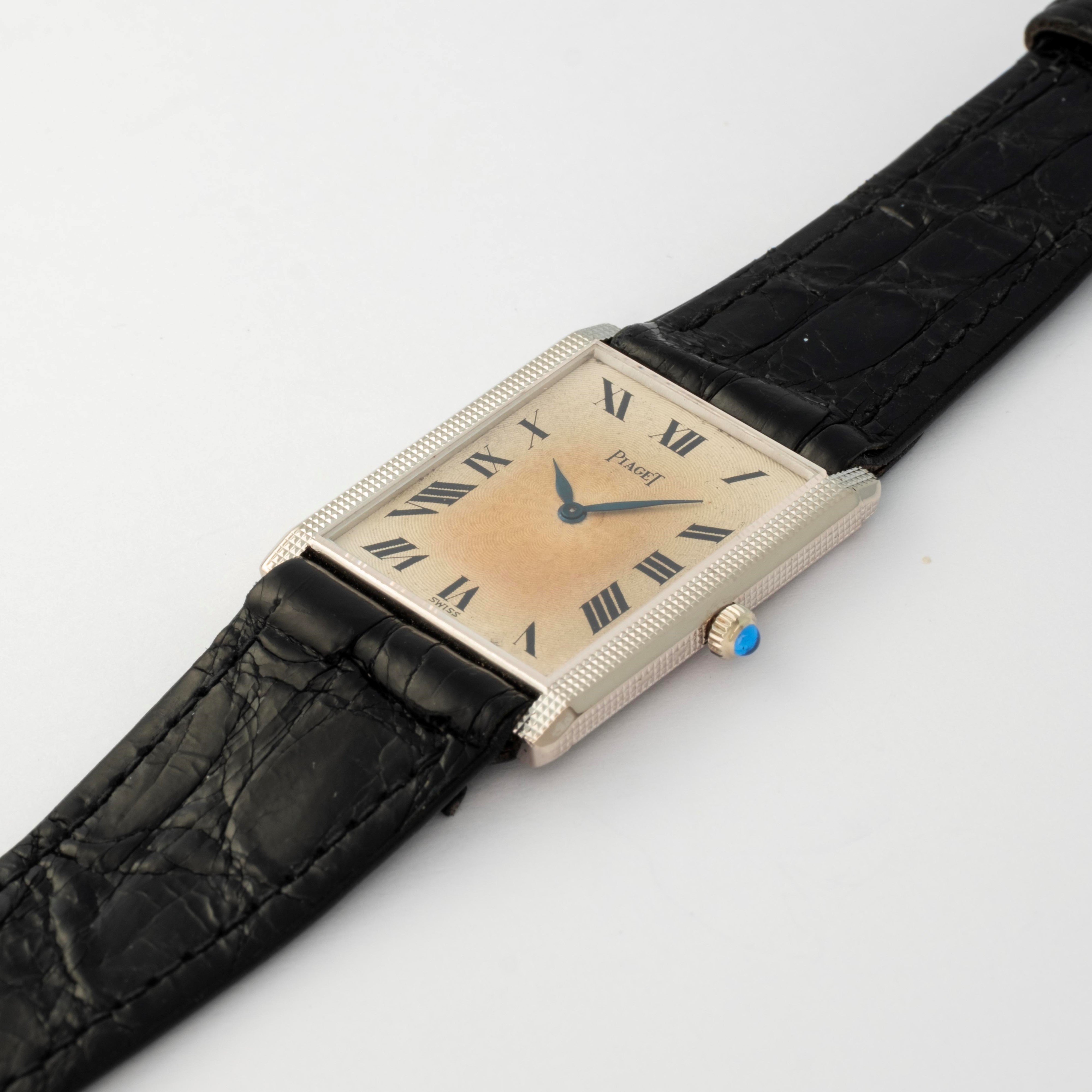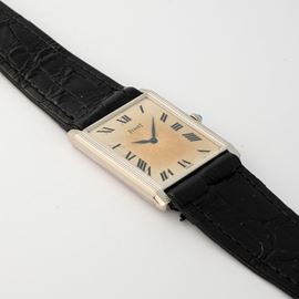 Tank extrapiatto in oro 18k, con quadrante guilloché e numeri romani, circa 1980